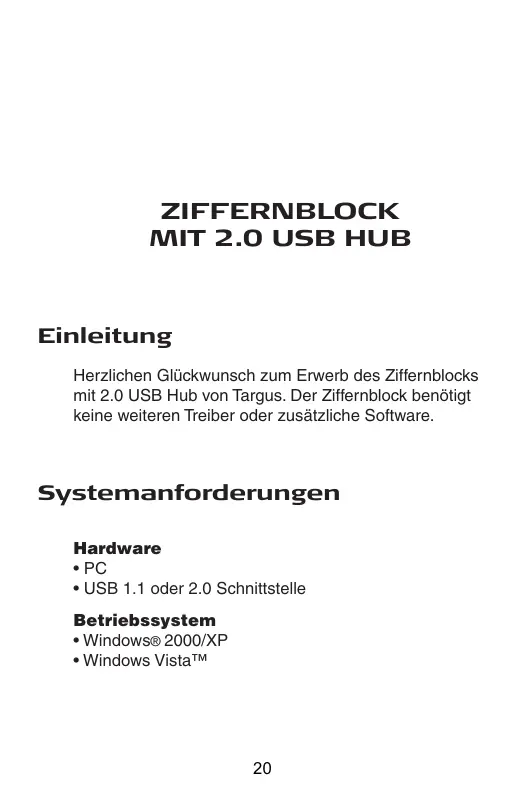 Einleitung Herzlichen Glückwunsch zum Erwerb des Ziffernblocks mit 2.0 USB Hub von Targus. Der Ziffernblock benötigt keine weiteren Treiber oder zusätzliche Software. Systemanforderungen Hardware