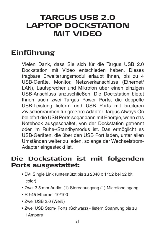 TARGUS USB 2.0 LAPTOP DOCKSTATION MIT VIDEO Einführung Vielen Dank, dass Sie sich für die Targus USB 2.0 Dockstation mit Video entschieden haben. Dieses tragbare Erweiterungsmodul erlaubt Ihnen, bis zu 4 USB-Geräte, Monitor, Netzwerkanschluss (Ethernet/ LAN), Lautsprecher und Mikrofon über einen einzigen USB-Anschluss anzuschließen. Die Dockstation bietet Ihnen auch zwei Targus Power Ports, die doppelte USB-Leistung liefern, und USB Ports mit breiteren Zwischenräumen für größere Adapter. Targus Always On beliefert die USB Ports sogar dann mit Energie, wenn das Notebook ausgeschaltet, von der Dockstation getrennt oder im Ruhe-/Standbymodus ist. Das ermöglicht es USB-Geräten, die über den USB Port laden, unter allen Umständen weiter zu laden, solange der WechselstromAdapter eingesteckt ist.