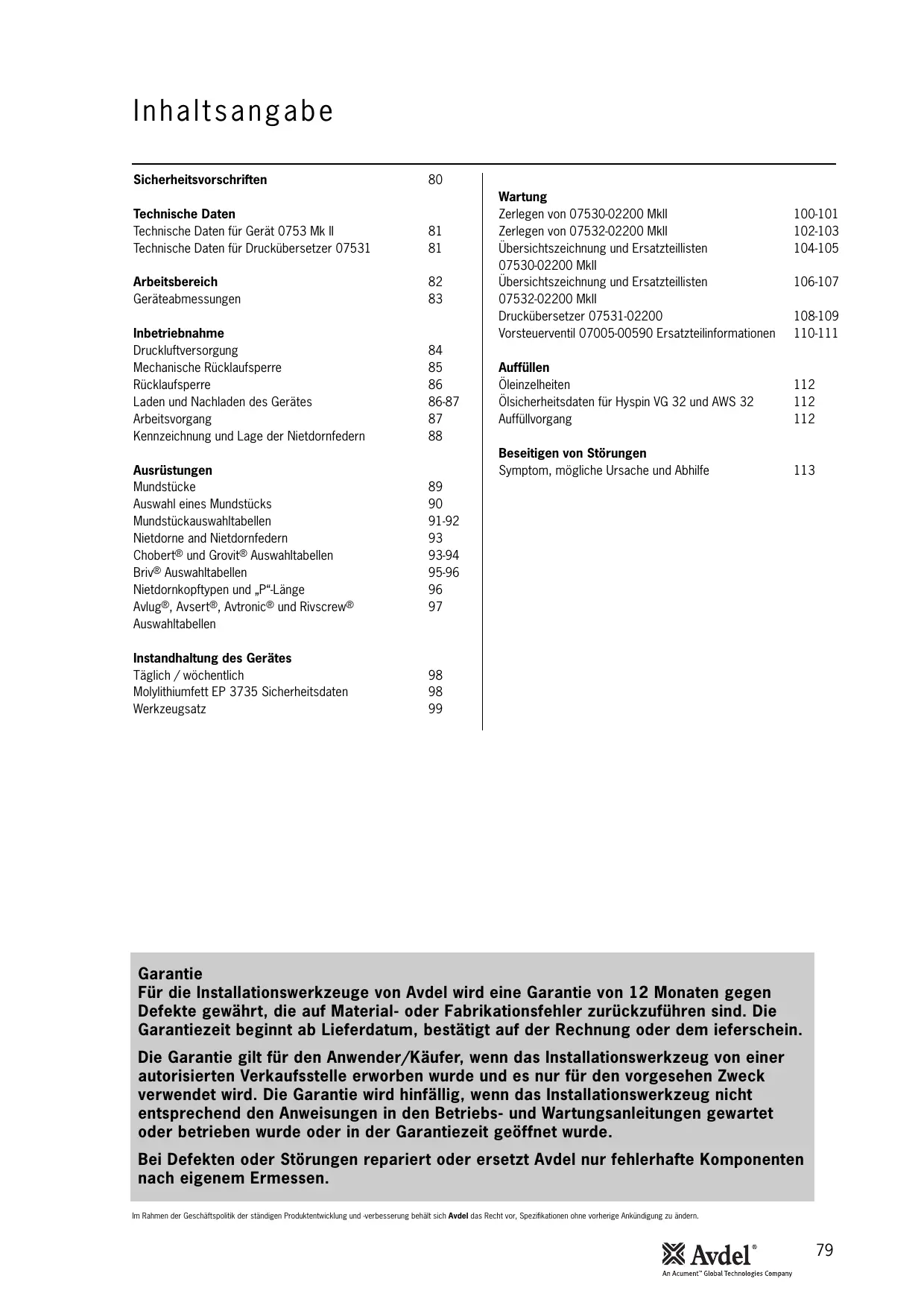 Inbetriebnahme Druckluftversorgung Mechanische Rücklaufsperre Rücklaufsperre Laden und Nachladen des Gerätes Arbeitsvorgang Kennzeichnung und Lage der Nietdornfedern Ausrüstungen Mundstücke Auswahl eines Mundstücks Mundstückauswahltabellen Nietdorne and Nietdornfedern Chobert® und Grovit® Auswahltabellen Briv® Auswahltabellen Nietdornkopftypen und „P“-Länge Avlug®, Avsert®, Avtronic® und Rivscrew® Auswahltabellen Instandhaltung des Gerätes Täglich / wöchentlich Molylithiumfett EP 3735 Sicherheitsdaten Werkzeugsatz