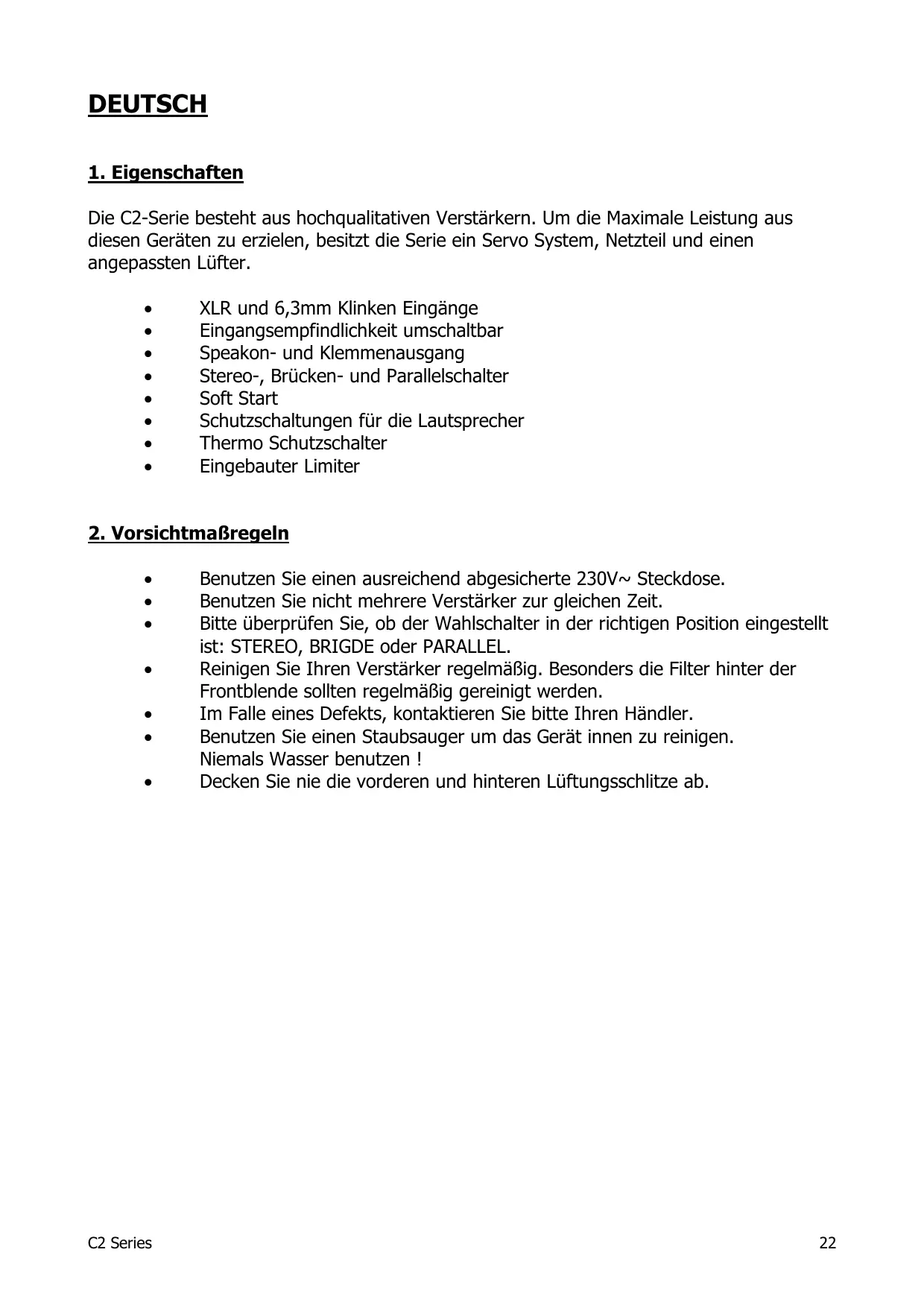 C2 Series Benutzen Sie einen ausreichend abgesicherte 230V~ Steckdose. Benutzen Sie nicht mehrere Verstärker zur gleichen Zeit. Bitte überprüfen Sie, ob der Wahlschalter in der richtigen Position eingestellt ist: STEREO, BRIGDE oder PARALLEL. Reinigen Sie Ihren Verstärker regelmäßig. Besonders die Filter hinter der Frontblende sollten regelmäßig gereinigt werden. Im Falle eines Defekts, kontaktieren Sie bitte Ihren Händler. Benutzen Sie einen Staubsauger um das Gerät innen zu reinigen. Niemals Wasser benutzen ! Decken Sie nie die vorderen und hinteren Lüftungsschlitze ab.