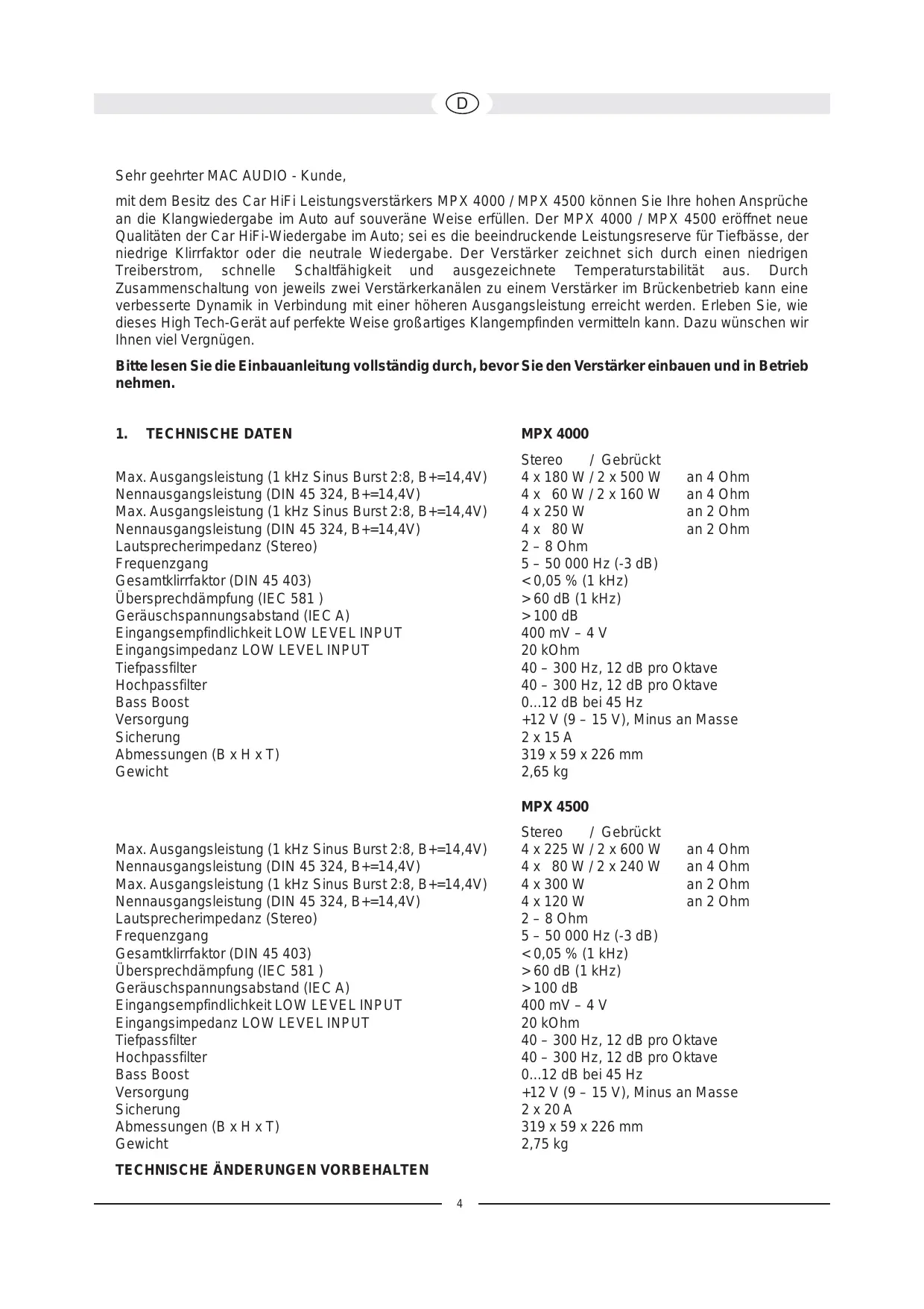 Sehr geehrter MAC AUDIO - Kunde, mit dem Besitz des Car HiFi Leistungsverstärkers MPX 4000 / MPX 4500 können Sie Ihre hohen Ansprüche an die Klangwiedergabe im Auto auf souveräne Weise erfüllen. Der MPX 4000 / MPX 4500 eröffnet neue Qualitäten der Car HiFi-Wiedergabe im Auto; sei es die beeindruckende Leistungsreserve für Tiefbässe, der niedrige Klirrfaktor oder die neutrale Wiedergabe. Der Verstärker zeichnet sich durch einen niedrigen Treiberstrom, schnelle Schaltfähigkeit und ausgezeichnete Temperaturstabilität aus. Durch Zusammenschaltung von jeweils zwei Verstärkerkanälen zu einem Verstärker im Brückenbetrieb kann eine verbesserte Dynamik in Verbindung mit einer höheren Ausgangsleistung erreicht werden. Erleben Sie, wie dieses High Tech-Gerät auf perfekte Weise großartiges Klangempfinden vermitteln kann. Dazu wünschen wir Ihnen viel Vergnügen. Bitte lesen Sie die Einbauanleitung vollständig durch, bevor Sie den Verstärker einbauen und in Betrieb nehmen.