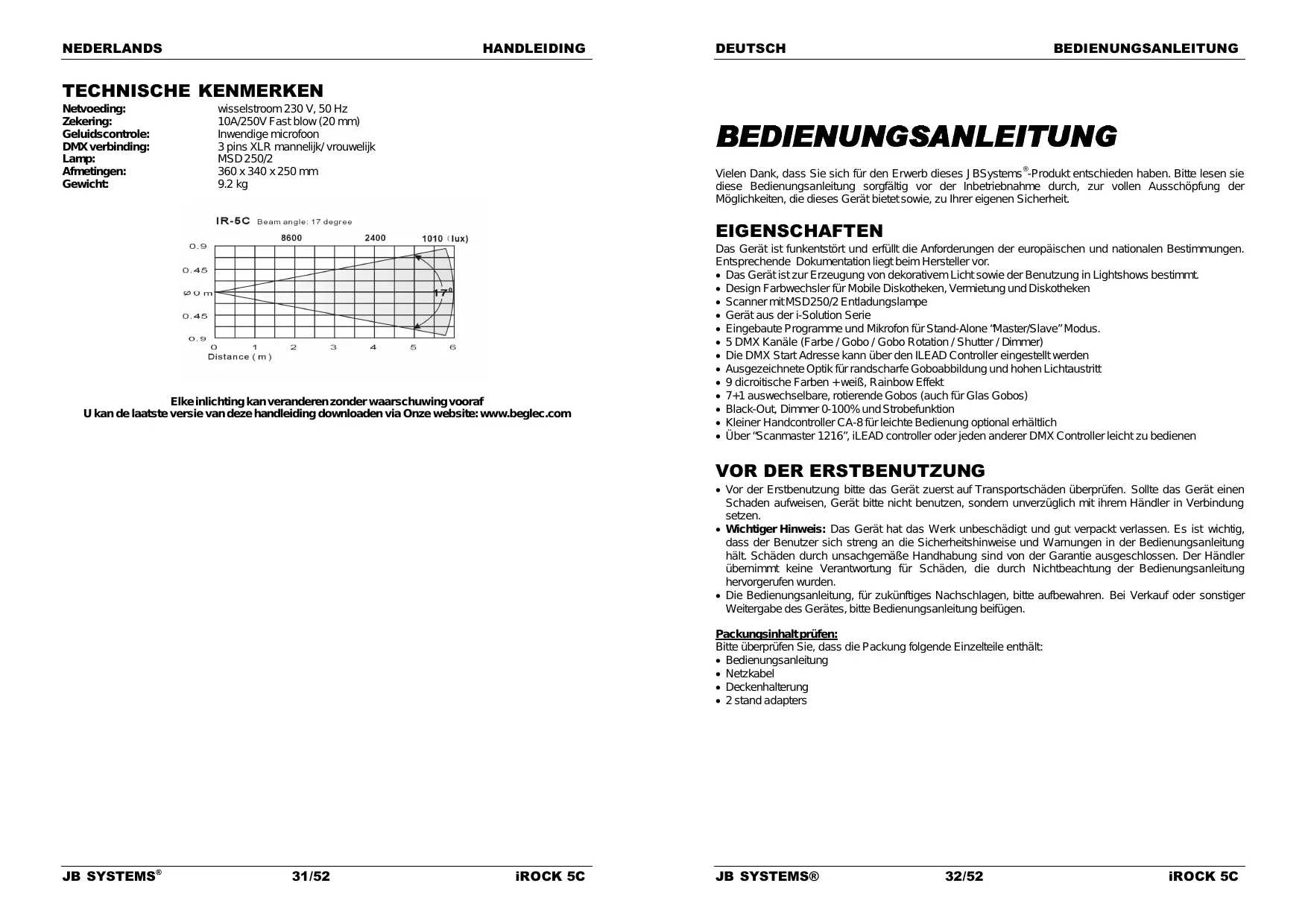 Vielen Dank, dass Sie sich für den Erwerb dieses JBSystems -Produkt entschieden haben. Bitte lesen sie diese Bedienungsanleitung sorgfältig vor der Inbetriebnahme durch, zur vollen Ausschöpfung der Möglichkeiten, die dieses Gerät bietet sowie, zu Ihrer eigenen Sicherheit. EIGENSCHAFTEN Elke inlichting kan veranderen zonder waarschuwing vooraf U kan de laatste versie van deze handleiding downloaden via Onze website: www.beglec.com Das Gerät ist funkentstört und erfüllt die Anforderungen der europäischen und nationalen Bestimmungen. Entsprechende Dokumentation liegt beim Hersteller vor. Das Gerät ist zur Erzeugung von dekorativem Licht sowie der Benutzung in Lightshows bestimmt. Design Farbwechsler für Mobile Diskotheken, Vermietung und Diskotheken Scanner mit MSD250/2 Entladungslampe Gerät aus der i-Solution Serie Eingebaute Programme und Mikrofon für Stand-Alone “Master/Slave” Modus. 5 DMX Kanäle (Farbe / Gobo / Gobo Rotation / Shutter / Dimmer) Die DMX Start Adresse kann über den ILEAD Controller eingestellt werden Ausgezeichnete Optik für randscharfe Goboabbildung und hohen Lichtaustritt 9 dicroitische Farben + weiß, Rainbow Effekt 7+1 auswechselbare, rotierende Gobos (auch für Glas Gobos) Black-Out, Dimmer 0-100% und Strobefunktion Kleiner Handcontroller CA-8 für leichte Bedienung optional erhältlich Über “Scanmaster 1216”, iLEAD controller oder jeden anderer DMX Controller leicht zu bedienen
