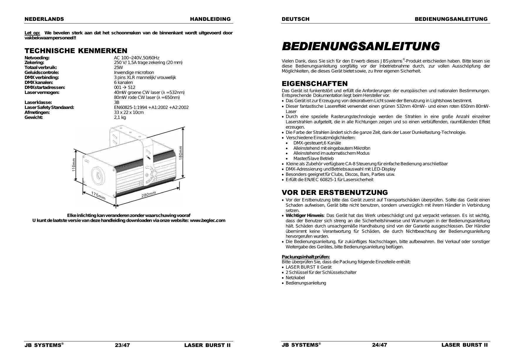 Elke inlichting kan veranderen zonder waarschuwing vooraf U kunt de laatste versie van deze handleiding downloaden via onze website: www.beglec.com Vor der Erstbenutzung bitte das Gerät zuerst auf Transportschäden überprüfen. Sollte das Gerät einen Schaden aufweisen, Gerät bitte nicht benutzen, sondern unverzüglich mit ihrem Händler in Verbindung setzen. Wichtiger Hinweis: Das Gerät hat das Werk unbeschädigt und gut verpackt verlassen. Es ist wichtig, dass der Benutzer sich streng an die Sicherheitshinweise und Warnungen in der Bedienungsanleitung hält. Schäden durch unsachgemäße Handhabung sind von der Garantie ausgeschlossen. Der Händler übernimmt keine Verantwortung für Schäden, die durch Nichtbeachtung der Bedienungsanleitung hervorgerufen wurden. Die Bedienungsanleitung, für zukünftiges Nachschlagen, bitte aufbewahren. Bei Verkauf oder sonstiger Weitergabe des Gerätes, bitte Bedienungsanleitung beifügen. Packungsinhalt prüfen: Bitte überprüfen Sie, dass die Packung folgende Einzelteile enthält: LASER BURST II Gerät 2 Schlüssel für der Schlüsselschalter Netzkabel Bedienungsanleitung JB SYSTEMS® 23/47