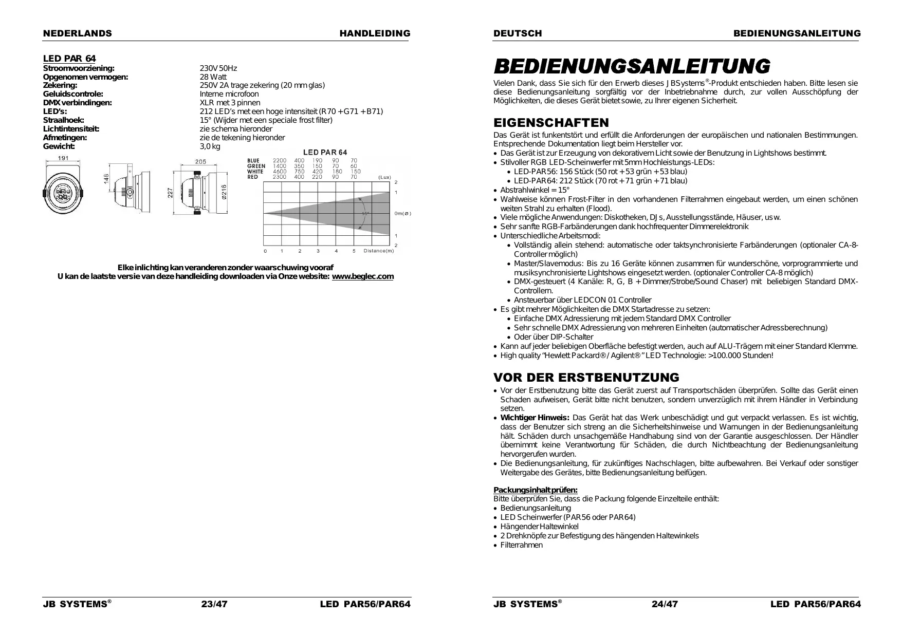 Vielen Dank, dass Sie sich für den Erwerb dieses JBSystems -Produkt entschieden haben. Bitte lesen sie diese Bedienungsanleitung sorgfältig vor der Inbetriebnahme durch, zur vollen Ausschöpfung der Möglichkeiten, die dieses Gerät bietet sowie, zu Ihrer eigenen Sicherheit. EIGENSCHAFTEN Das Gerät ist funkentstört und erfüllt die Anforderungen der europäischen und nationalen Bestimmungen. Entsprechende Dokumentation liegt beim Hersteller vor. Das Gerät ist zur Erzeugung von dekorativem Licht sowie der Benutzung in Lightshows bestimmt. Stilvoller RGB LED-Scheinwerfer mit 5mm Hochleistungs-LEDs: LED-PAR56: 156 Stück (50 rot + 53 grün + 53 blau) LED-PAR64: 212 Stück (70 rot + 71 grün + 71 blau) Abstrahlwinkel = 15° Wahlweise können Frost-Filter in den vorhandenen Filterrahmen eingebaut werden, um einen schönen weiten Strahl zu erhalten (Flood). Viele mögliche Anwendungen: Diskotheken, DJs, Ausstellungsstände, Häuser, usw. Sehr sanfte RGB-Farbänderungen dank hochfrequenter Dimmerelektronik Unterschiedliche Arbeitsmodi: Vollständig allein stehend: automatische oder taktsynchronisierte Farbänderungen (optionaler CA-8Controller möglich) Master/Slavemodus: Bis zu 16 Geräte können zusammen für wunderschöne, vorprogrammierte und musiksynchronisierte Lightshows eingesetzt werden. (optionaler Controller CA-8 möglich) DMX-gesteuert (4 Kanäle: R, G, B + Dimmer/Strobe/Sound Chaser) mit beliebigen Standard DMXControllern. Ansteuerbar über LEDCON 01 Controller Es gibt mehrer Möglichkeiten die DMX Startadresse zu setzen: Einfache DMX Adressierung mit jedem Standard DMX Controller Sehr schnelle DMX Adressierung von mehreren Einheiten (automatischer Adressberechnung) Oder über DIP-Schalter Kann auf jeder beliebigen Oberfläche befestigt werden, auch auf ALU-Trägern mit einer Standard Klemme. High quality “Hewlett Packard® / Agilent® ” LED Technologie: >100.000 Stunden!