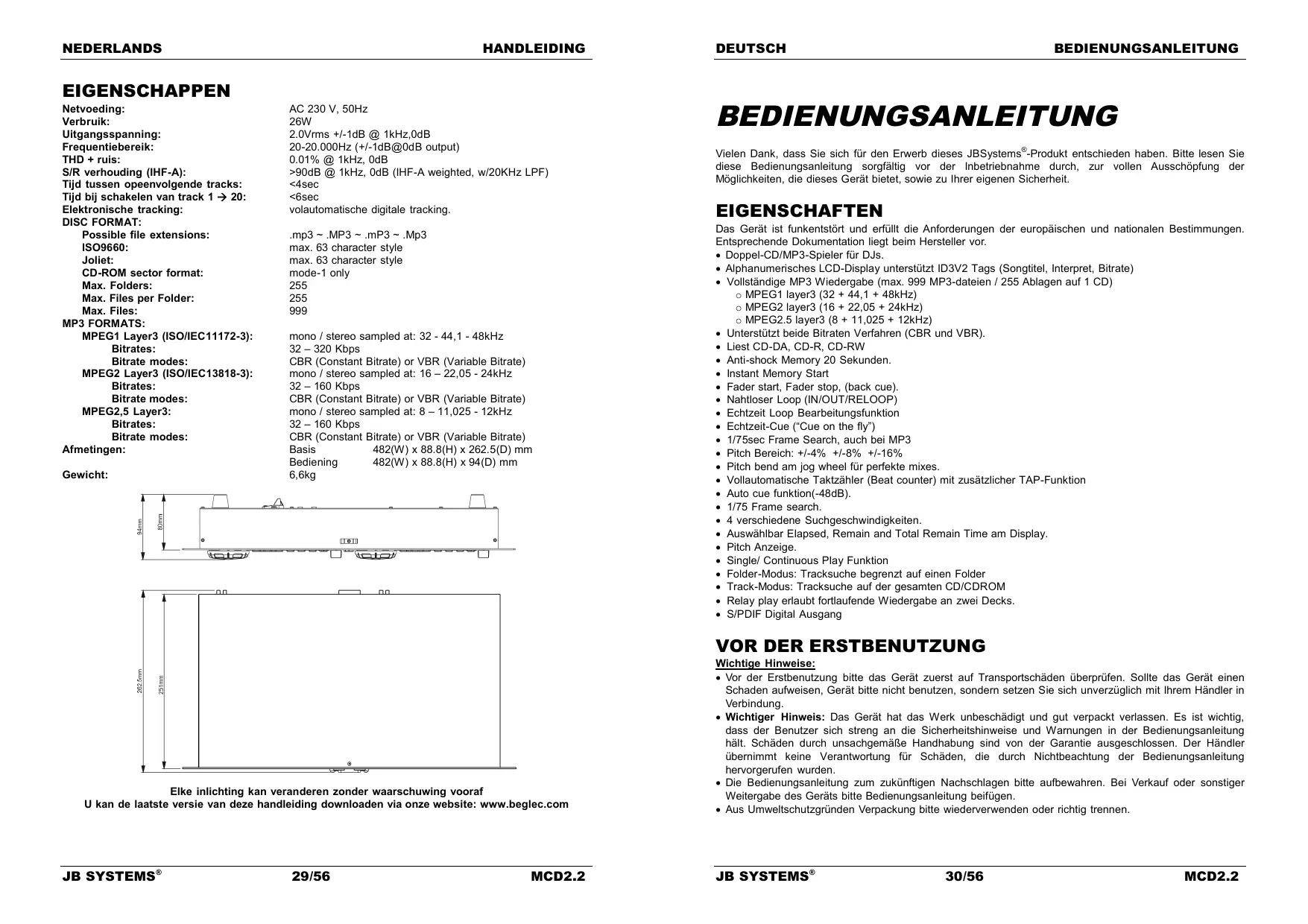 Vielen Dank, dass Sie sich für den Erwerb dieses JBSystems -Produkt entschieden haben. Bitte lesen Sie diese Bedienungsanleitung sorgfältig vor der Inbetriebnahme durch, zur vollen Ausschöpfung der Möglichkeiten, die dieses Gerät bietet, sowie zu Ihrer eigenen Sicherheit. EIGENSCHAFTEN Das Gerät ist funkentstört und erfüllt die Anforderungen der europäischen und nationalen Bestimmungen. Entsprechende Dokumentation liegt beim Hersteller vor. Doppel-CD/MP3-Spieler für DJs. Alphanumerisches LCD-Display unterstützt ID3V2 Tags (Songtitel, Interpret, Bitrate) Vollständige MP3 Wiedergabe (max. 999 MP3-dateien / 255 Ablagen auf 1 CD) o MPEG1 layer3 (32 + 44,1 + 48kHz) o MPEG2 layer3 (16 + 22,05 + 24kHz) o MPEG2.5 layer3 (8 + 11,025 + 12kHz) Unterstützt beide Bitraten Verfahren (CBR und VBR). Liest CD-DA, CD-R, CD-RW Anti-shock Memory 20 Sekunden. Instant Memory Start Fader start, Fader stop, (back cue). Nahtloser Loop (IN/OUT/RELOOP) Echtzeit Loop Bearbeitungsfunktion Echtzeit-Cue (“Cue on the fly”) 1/75sec Frame Search, auch bei MP3 Pitch Bereich: +/-4% +/-8% +/-16% Pitch bend am jog wheel für perfekte mixes. Vollautomatische Taktzähler (Beat counter) mit zusätzlicher TAP-Funktion Auto cue funktion(-48dB). 1/75 Frame search. 4 verschiedene Suchgeschwindigkeiten. Auswählbar Elapsed, Remain and Total Remain Time am Display. Pitch Anzeige. Single/ Continuous Play Funktion Folder-Modus: Tracksuche begrenzt auf einen Folder Track-Modus: Tracksuche auf der gesamten CD/CDROM Relay play erlaubt fortlaufende Wiedergabe an zwei Decks. S/PDIF Digital Ausgang