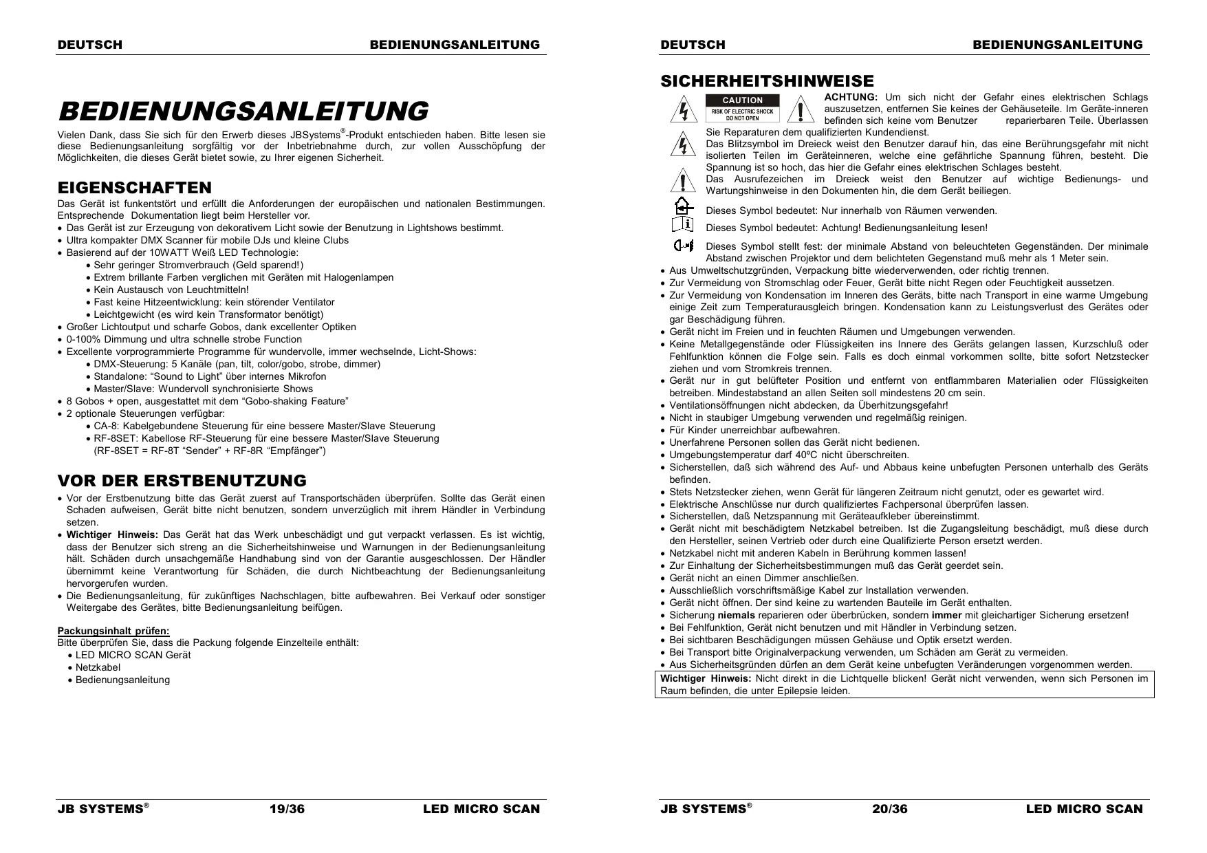 Vor der Erstbenutzung bitte das Gerät zuerst auf Transportschäden überprüfen. Sollte das Gerät einen Schaden aufweisen, Gerät bitte nicht benutzen, sondern unverzüglich mit ihrem Händler in Verbindung setzen. Wichtiger Hinweis: Das Gerät hat das Werk unbeschädigt und gut verpackt verlassen. Es ist wichtig, dass der Benutzer sich streng an die Sicherheitshinweise und Warnungen in der Bedienungsanleitung hält. Schäden durch unsachgemäße Handhabung sind von der Garantie ausgeschlossen. Der Händler übernimmt keine Verantwortung für Schäden, die durch Nichtbeachtung der Bedienungsanleitung hervorgerufen wurden. Die Bedienungsanleitung, für zukünftiges Nachschlagen, bitte aufbewahren. Bei Verkauf oder sonstiger Weitergabe des Gerätes, bitte Bedienungsanleitung beifügen. Packungsinhalt prüfen: Bitte überprüfen Sie, dass die Packung folgende Einzelteile enthält: LED MICRO SCAN Gerät Netzkabel Bedienungsanleitung JB SYSTEMS® 19/36