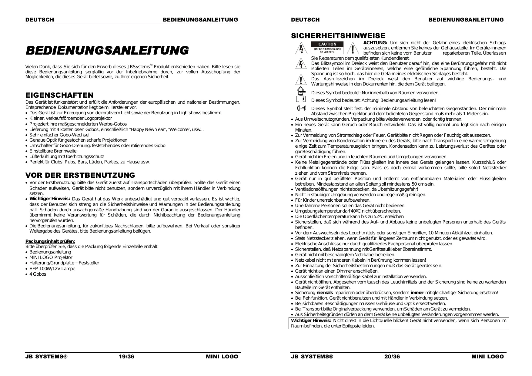 Vor der Erstbenutzung bitte das Gerät zuerst auf Transportschäden überprüfen. Sollte das Gerät einen Schaden aufweisen, Gerät bitte nicht benutzen, sondern unverzüglich mit ihrem Händler in Verbindung setzen. Wichtiger Hinweis: Das Gerät hat das Werk unbeschädigt und gut verpackt verlassen. Es ist wichtig, dass der Benutzer sich streng an die Sicherheitshinweise und Warnungen in der Bedienungsanleitung hält. Schäden durch unsachgemäße Handhabung sind von der Garantie ausgeschlossen. Der Händler übernimmt keine Verantwortung für Schäden, die durch Nichtbeachtung der Bedienungsanleitung hervorgerufen wurden. Die Bedienungsanleitung, für zukünftiges Nachschlagen, bitte aufbewahren. Bei Verkauf oder sonstiger Weitergabe des Gerätes, bitte Bedienungsanleitung beifügen. Packungsinhalt prüfen: Bitte überprüfen Sie, dass die Packung folgende Einzelteile enthält: Bedienungsanleitung MINI LOGO Projektor Halterung/Grundplatte + Feststeller EFP 100W/12V Lampe 4 Gobos JB SYSTEMS® 19/36 MINI LOGO Dieses Symbol bedeutet: Achtung! Bedienungsanleitung lesen! Dieses Symbol stellt fest: der minimale Abstand von beleuchteten Gegenständen. Der minimale Abstand zwischen Projektor und dem belichteten Gegenstand muß mehr als 1 Meter sein. Aus Umweltschutzgründen, Verpackung bitte wiederverwenden, oder richtig trennen. Ein neues Gerät kann Geruch oder Rauch entwickeln. Das ist völlig normal und legt sich nach einigen Minuten. Zur Vermeidung von Stromschlag oder Feuer, Gerät bitte nicht Regen oder Feuchtigkeit aussetzen. Zur Vermeidung von Kondensation im Inneren des Geräts, bitte nach Transport in eine warme Umgebung einige Zeit zum Temperaturausgleich bringen. Kondensation kann zu Leistungsverlust des Gerätes oder gar Beschädigung führen. Gerät nicht im Freien und in feuchten Räumen und Umgebungen verwenden. Keine Metallgegenstände oder Flüssigkeiten ins Innere des Geräts gelangen lassen, Kurzschluß oder Fehlfunktion können die Folge sein. Falls es doch einmal vorkommen sollte, bitte sofort Netzstecker ziehen und vom Stromkreis trennen. Gerät nur in gut belüfteter Position und entfernt von entflammbaren Materialien oder Flüssigkeiten betreiben. Mindestabstand an allen Seiten soll mindestens 50 cm sein. Ventilationsöffnungen nicht abdecken, da Überhitzungsgefahr! Nicht in staubiger Umgebung verwenden und regelmäßig reinigen. Für Kinder unerreichbar aufbewahren. Unerfahrene Personen sollen das Gerät nicht bedienen. Umgebungstemperatur darf 40ºC nicht überschreiten. Die Oberflächentemperatur kann bis zu 52ºC erreichen Sicherstellen, daß sich während des Auf- und Abbaus keine unbefugten Personen unterhalb des Geräts befinden. Vor dem Auswechseln des Leuchtmittels oder sonstigen Eingriffen, 10 Minuten Abkühlzeit einhalten. Stets Netzstecker ziehen, wenn Gerät für längeren Zeitraum nicht genutzt, oder es gewartet wird. Elektrische Anschlüsse nur durch qualifiziertes Fachpersonal überprüfen lassen. Sicherstellen, daß Netzspannung mit Geräteaufkleber übereinstimmt. Gerät nicht mit beschädigtem Netzkabel betreiben. Netzkabel nicht mit anderen Kabeln in Berührung kommen lassen! Zur Einhaltung der Sicherheitsbestimmungen muß das Gerät geerdet sein. Gerät nicht an einen Dimmer anschließen. Ausschließlich vorschriftsmäßige Kabel zur Installation verwenden. Gerät nicht öffnen. Abgesehen vom tausch des Leuchtmittels und der Sicherung sind keine zu wartenden Bauteile im Gerät enthalten. Sicherung niemals reparieren oder überbrücken, sondern immer mit gleichartiger Sicherung ersetzen! Bei Fehlfunktion, Gerät nicht benutzen und mit Händler in Verbindung setzen. Bei sichtbaren Beschädigungen müssen Gehäuse und Optik ersetzt werden. Bei Transport bitte Originalverpackung verwenden, um Schäden am Gerät zu vermeiden. Aus Sicherheitsgründen dürfen an dem Gerät keine unbefugten Veränderungen vorgenommen werden. Wichtiger Hinweis: Nicht direkt in die Lichtquelle blicken! Gerät nicht verwenden, wenn sich Personen im Raum befinden, die unter Epilepsie leiden. JB SYSTEMS® 20/36 MINI LOGO DEUTSCH BEDIENUNGSANLEITUNG BESCHREIBUNG DEUTSCH BEDIENUNGSANLEITUNG