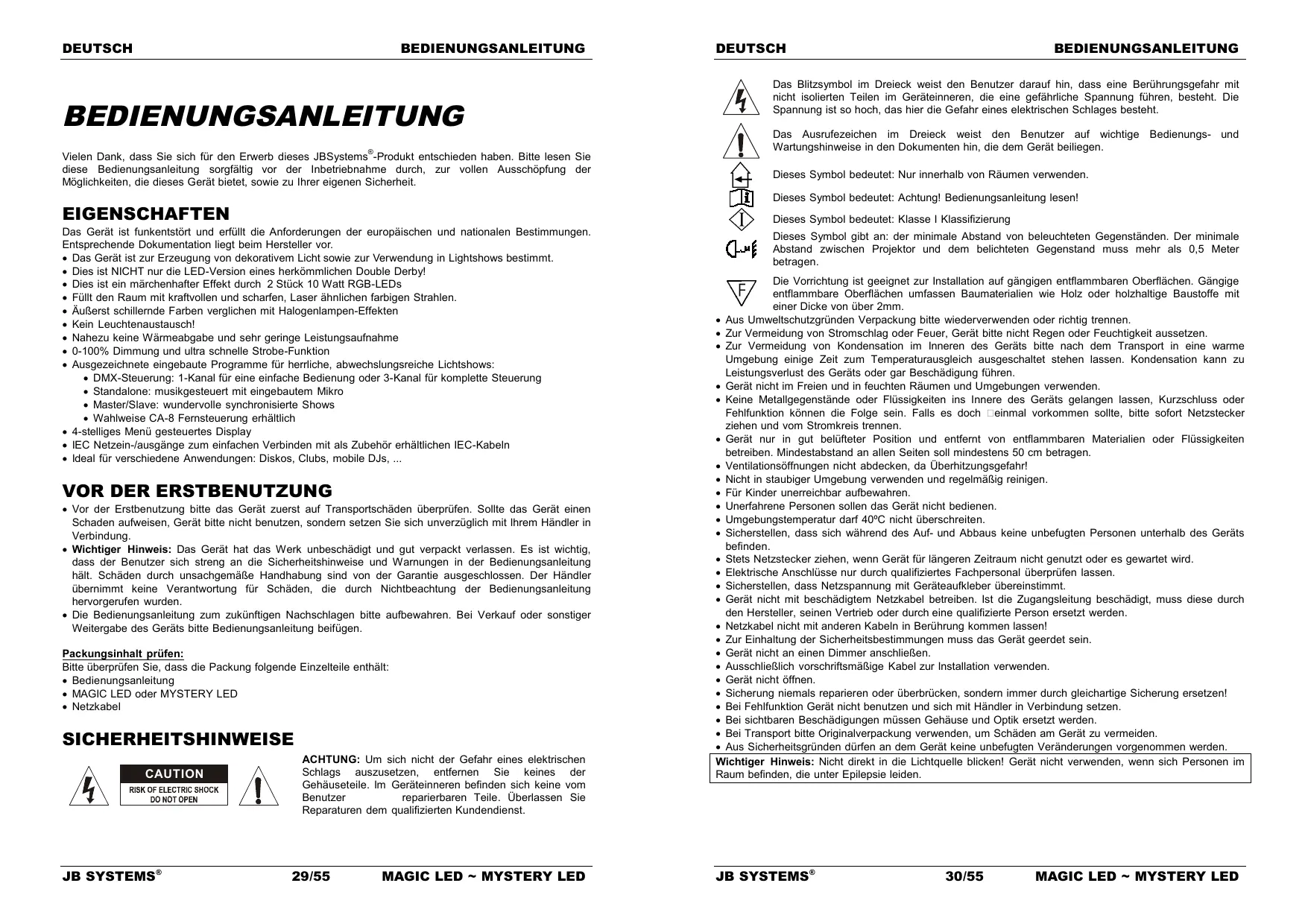 Vor der Erstbenutzung bitte das Gerät zuerst auf Transportschäden überprüfen. Sollte das Gerät einen Schaden aufweisen, Gerät bitte nicht benutzen, sondern setzen Sie sich unverzüglich mit Ihrem Händler in Verbindung. Wichtiger Hinweis: Das Gerät hat das Werk unbeschädigt und gut verpackt verlassen. Es ist wichtig, dass der Benutzer sich streng an die Sicherheitshinweise und Warnungen in der Bedienungsanleitung hält. Schäden durch unsachgemäße Handhabung sind von der Garantie ausgeschlossen. Der Händler übernimmt keine Verantwortung für Schäden, die durch Nichtbeachtung der Bedienungsanleitung hervorgerufen wurden. Die Bedienungsanleitung zum zukünftigen Nachschlagen bitte aufbewahren. Bei Verkauf oder sonstiger Weitergabe des Geräts bitte Bedienungsanleitung beifügen. Packungsinhalt prüfen: Bitte überprüfen Sie, dass die Packung folgende Einzelteile enthält: Bedienungsanleitung MAGIC LED oder MYSTERY LED Netzkabel SICHERHEITSHINWEISE JB SYSTEMS® BEDIENUNGSANLEITUNG Dieses Symbol bedeutet: Achtung! Bedienungsanleitung lesen! EIGENSCHAFTEN CAUTION DEUTSCH ACHTUNG: Um sich nicht der Gefahr eines elektrischen Schlags auszusetzen, entfernen Sie keines der Gehäuseteile. Im Geräteinneren befinden sich keine vom Benutzer reparierbaren Teile. Überlassen Sie Reparaturen dem qualifizierten Kundendienst. 29/55
