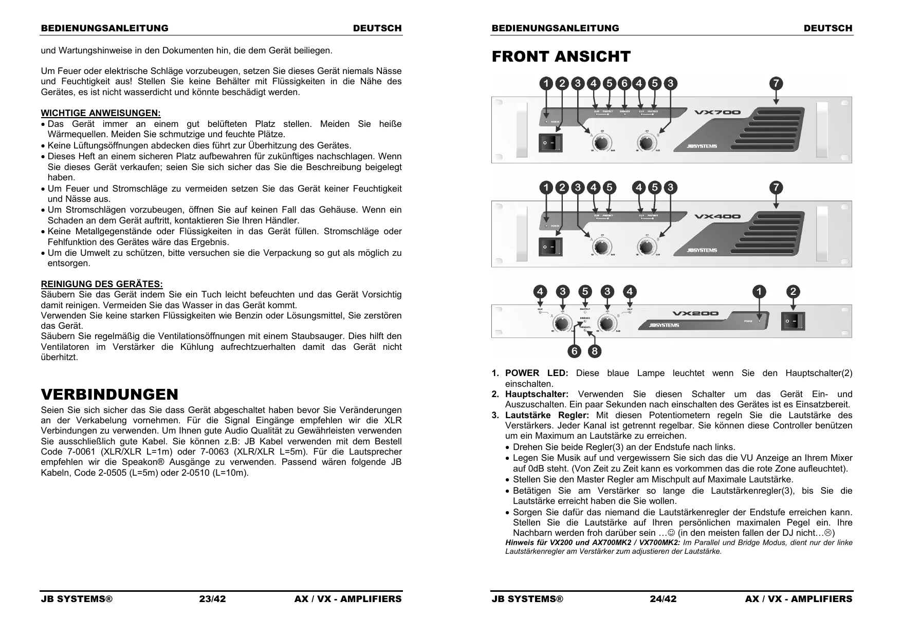 - Sorgen Sie dafür das niemand die Lautstärkenregler der Endstufe erreichen kann. Stellen Sie die Lautstärke auf Ihren persönlichen maximalen Pegel ein. Ihre Nachbarn werden froh darüber sein …☺ (in den meisten fallen der DJ nicht… ) Hinweis für VX200 und AX700MK2 / VX700MK2: Im Parallel und Bridge Modus, dient nur der linke Lautstärkenregler am Verstärker zum adjustieren der Lautstärke. JB SYSTEMS® 23/42