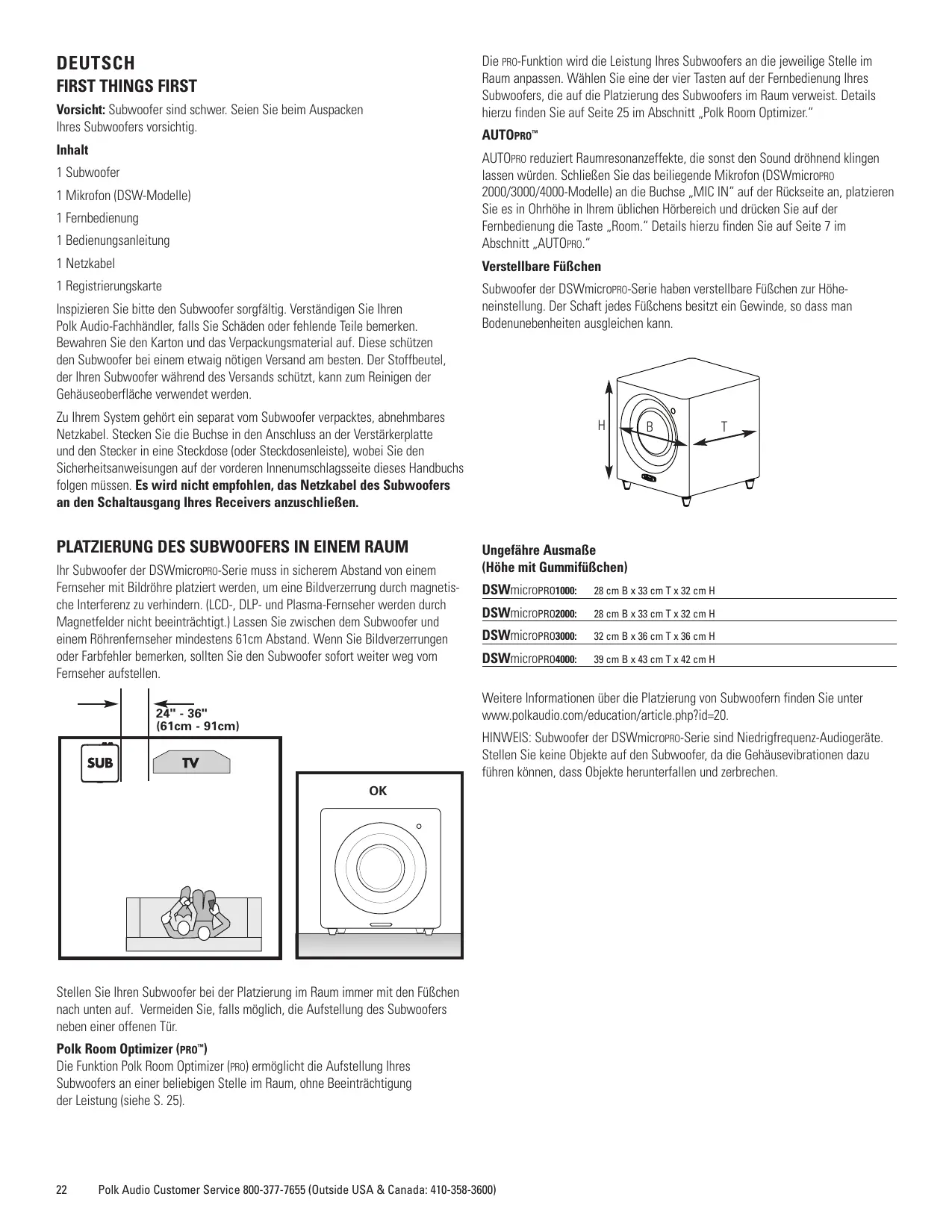 Wenn Sie Probleme haben, nachdem Sie den Anschlussanweisungen gefolgt sind, sollenn Sie alle Kabelverbindungen nochmals prufen. Wenn Sie ein Problem am Subwoofer feststellen, kontaktieren Sieitte ihren autorisierten Polk Audio-Fachhändler, von dem Sie inh gekauft haben, oder rufen den Kundendienst von Polk Audio an: 1-800-377-7655 (nur aus den USA und Kanada), +1 410-358-3600, 9-18 Uhr Ostkūstenzeit, Mo-Fr.