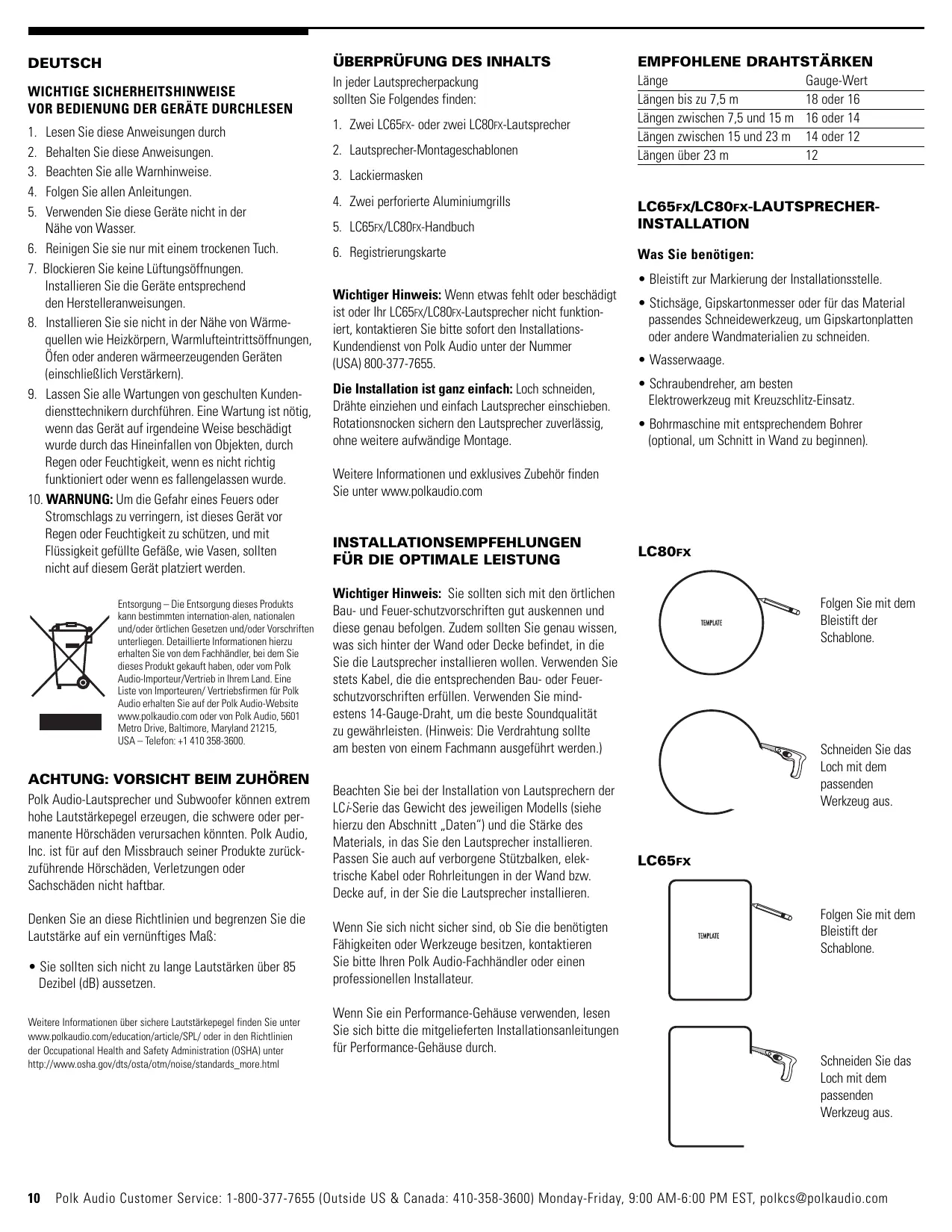 LC80FX Wichtiger Hinweis: Sie sollten sich mit den örtlichen Bau- und Feuer-schutzvorschriften gut auskennen und diese genau befolgen. Zudem sollten Sie genau wissen, was sich hinter der Wand oder Decke befindet, in die Sie die Lautsprecher installieren wollen. Verwenden Sie stets Kabel, die die entsprechenden Bau- oder Feuerschutzvorschriften erfüllen. Verwenden Sie mindestens 14-Gauge-Draht, um die beste Soundqualität zu gewährleisten. (Hinweis: Die Verdrahtung sollte am besten von einem Fachmann ausgeführt werden.) Beachten Sie bei der Installation von Lautsprechern der LCi-Serie das Gewicht des jeweiligen Modells (siehe hierzu den Abschnitt „Daten“) und die Stärke des Materials, in das Sie den Lautsprecher installieren. Passen Sie auch auf verborgene Stützbalken, elektrische Kabel oder Rohrleitungen in der Wand bzw. Decke auf, in der Sie die Lautsprecher installieren. Wenn Sie sich nicht sicher sind, ob Sie die benötigten Fähigkeiten oder Werkzeuge besitzen, kontaktieren Sie bitte Ihren Polk Audio-Fachhändler oder einen professionellen Installateur. Wenn Sie ein Performance-Gehäuse verwenden, lesen Sie sich bitte die mitgelieferten Installationsanleitungen für Performance-Gehäuse durch. Folgen Sie mit dem Bleistift der Schablone. Schneiden Sie das Loch mit dem passenden Werkzeug aus. LC65FX Folgen Sie mit dem Bleistift der Schablone. Schneiden Sie das Loch mit dem passenden Werkzeug aus. Polk Audio Customer Service: 1-800-377-7655 (Outside US & Canada: 410-358-3600) Monday-Friday, 9:00 AM-6:00 PM EST, polkcs@polkaudio.com ABMESSUNGEN DATEN LC80FX Gesamtdurchmesser 10-11/16" (27.15cm) Gesamttiefe 5-5/16" (13,5cm) Ausschnittdurchmesser 9-3/8" (24cm) polkaudio Einbautiefe (Geht von 12,7 mm dicker Gipskartonplatte aus) 4-5/8" (11,75cm) Modell LC80FX Empfohlene Verstärkerleistung (W/Kanal) 10-125W Nennimpedanz 4 Ohms Frequenzgang (+/-3 dB) 30Hz – 27kHz (80Hz-26kHz) Leistung (2,83 V bei 1 M) 88db Lautsprechergewicht 4 lbs. (1,81kg) Modell LC65FX Empfohlene Verstärkerleistung (W/Kanal) 10-125W Nennimpedanz 4 Ohms Frequenzgang (+/-3 dB) 30Hz – 27kHz (45Hz-26kHz) Leistung (2,83 V bei 1 M) 88db Lautsprechergewicht 4,35 lbs. (1,97kg) Gesamttiefe 3-3/4" (9,53cm) LC65FX AusschnittHöhe 12-3/4" (32,4cm) Höhe 14-5/16" (36,4cm) Breite 8-1/2" (21,59cm) Einbautiefe (Geht von 12,7 mm dicker Gipskartonplatte aus) 3-1/4" (8,26cm) Ausschnitt-Breite 7-1/4" (18,41cm) For more information visit our website at www.polkaudio.com