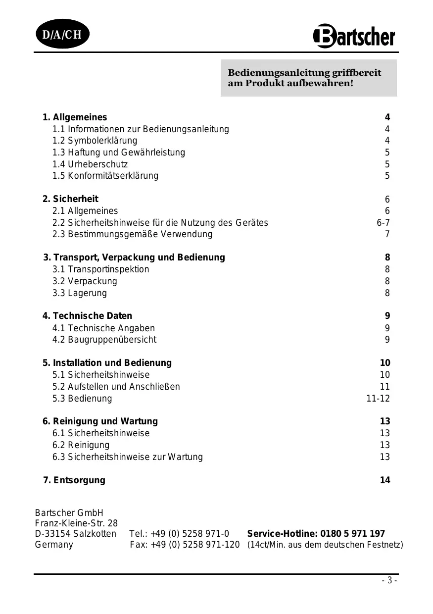 Finden Sie kostenlos die Bedienungsanleitung des Geräts A151.5001 BARTSCHER als PDF.