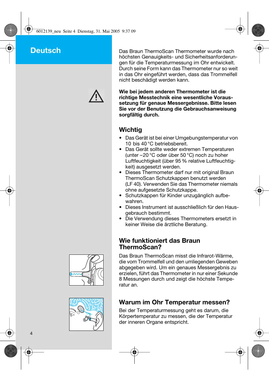 6012139_neu Seite 4 Dienstag, 31. Mai 2005 9:37 09 Deutsch Das Braun ThermoScan Thermometer wurde nach höchsten Genauigkeits- und Sicherheitsanforderungen für die Temperaturmessung im Ohr entwickelt. Durch seine Form kann das Thermometer nur so weit in das Ohr eingeführt werden, dass das Trommelfell nicht beschädigt werden kann. Wie bei jedem anderen Thermometer ist die richtige Messtechnik eine wesentliche Voraussetzung für genaue Messergebnisse. Bitte lesen Sie vor der Benutzung die Gebrauchsanweisung sorgfältig durch. Wichtig