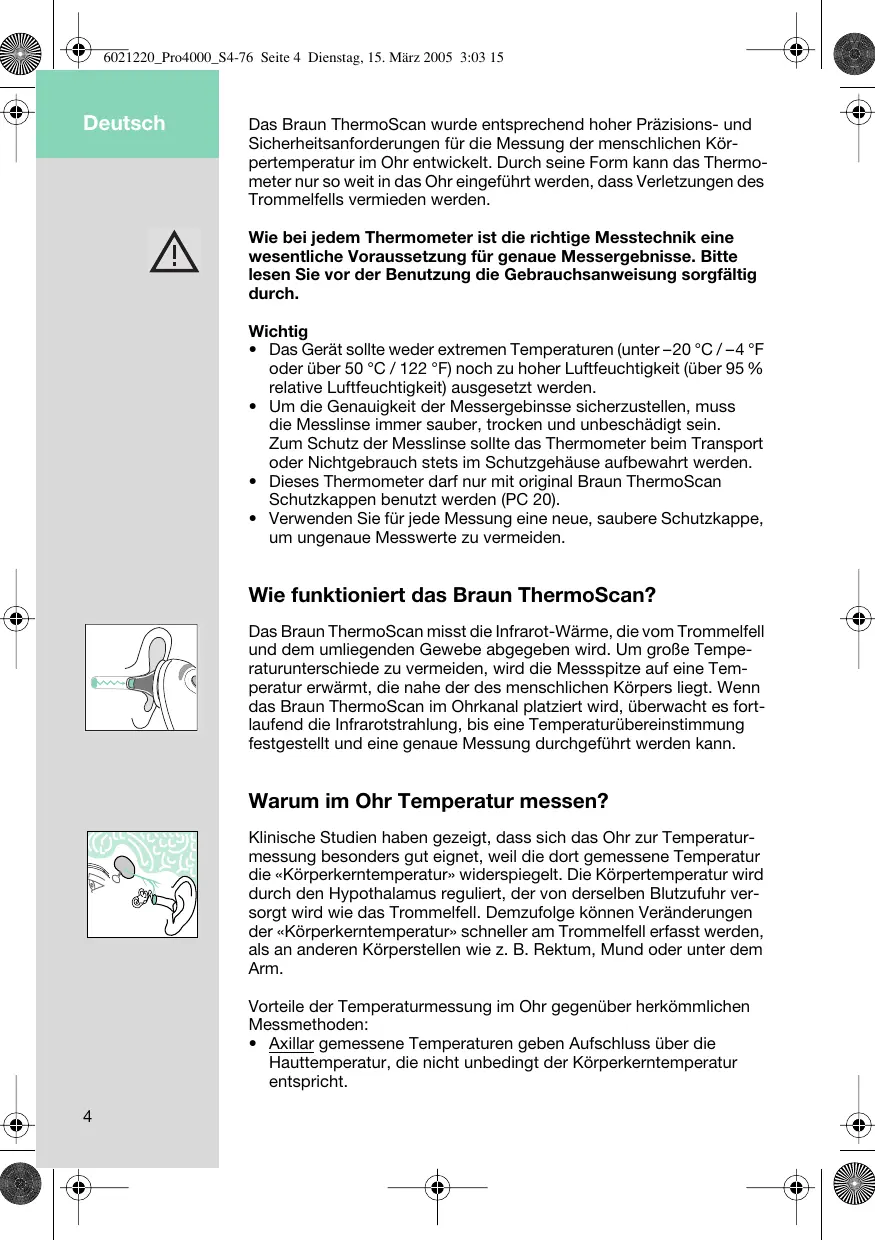 6021220_Pro4000_S4-76 Seite 4 Dienstag, 15. März 2005 3:03 15 Deutsch Das Braun ThermoScan wurde entsprechend hoher Präzisions- und Sicherheitsanforderungen für die Messung der menschlichen Körpertemperatur im Ohr entwickelt. Durch seine Form kann das Thermometer nur so weit in das Ohr eingeführt werden, dass Verletzungen des Trommelfells vermieden werden. Wie bei jedem Thermometer ist die richtige Messtechnik eine wesentliche Voraussetzung für genaue Messergebnisse. Bitte lesen Sie vor der Benutzung die Gebrauchsanweisung sorgfältig durch. Wichtig