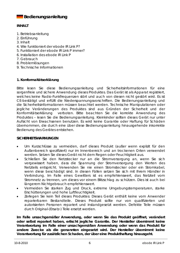 Bitte lessen Sie diese Bedienungsanleitung und Sicherheitsinformationen für eine sorgenfreie und sichere Anwendung these Produkte. Das Gerät ist als Apparat registriert, welche keine Radio-Funkfrequenzen stört und auch von diesen nicht gestört wird. Es ist CE-bestätig und erfüllt die Niederspannungsvorschriften. Die Bedienungsanleitung und die Sicherheitsinformationen müssen beachvet werden. Technische Manipulationen oder jegliche Veränderungen des Produktes sind aus Gründen der Sicherheit und der Konformitätserklärung verboten.itte beachten Sie die korrekte Anwendung des Produktés - lesen Sie die Bedienungsanleitung. Kleinkinder sollen deneses Gerät nur unter Aufsicht von Erwachsenen benutzten. Es wird keine Garantie oder Haftung fur Schäden übernommen, die durch eine über diebedienungsanleitung hinausgehende inkorrekte Bedienung des Gerätes entstehen.