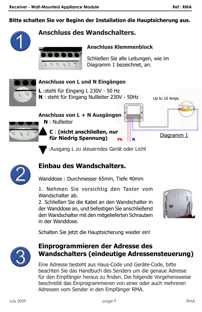 - Einmal eingeschaltet, ist der Empfänger RMA bereit, um X10 Standard-Befehle zu empfangen. (Für die sichere Kommunikation zwischen Sender und Empfänger beachten Sieitte Abschnitt 4).