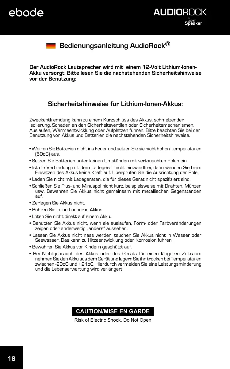 Der AudioRock Laufsprecher wird mit einem 12-Volt Lithium-Ionen-Akku versorgt.itte lessen Sie die nachstehenden Sicherheitshinweise vor der Benutzung: