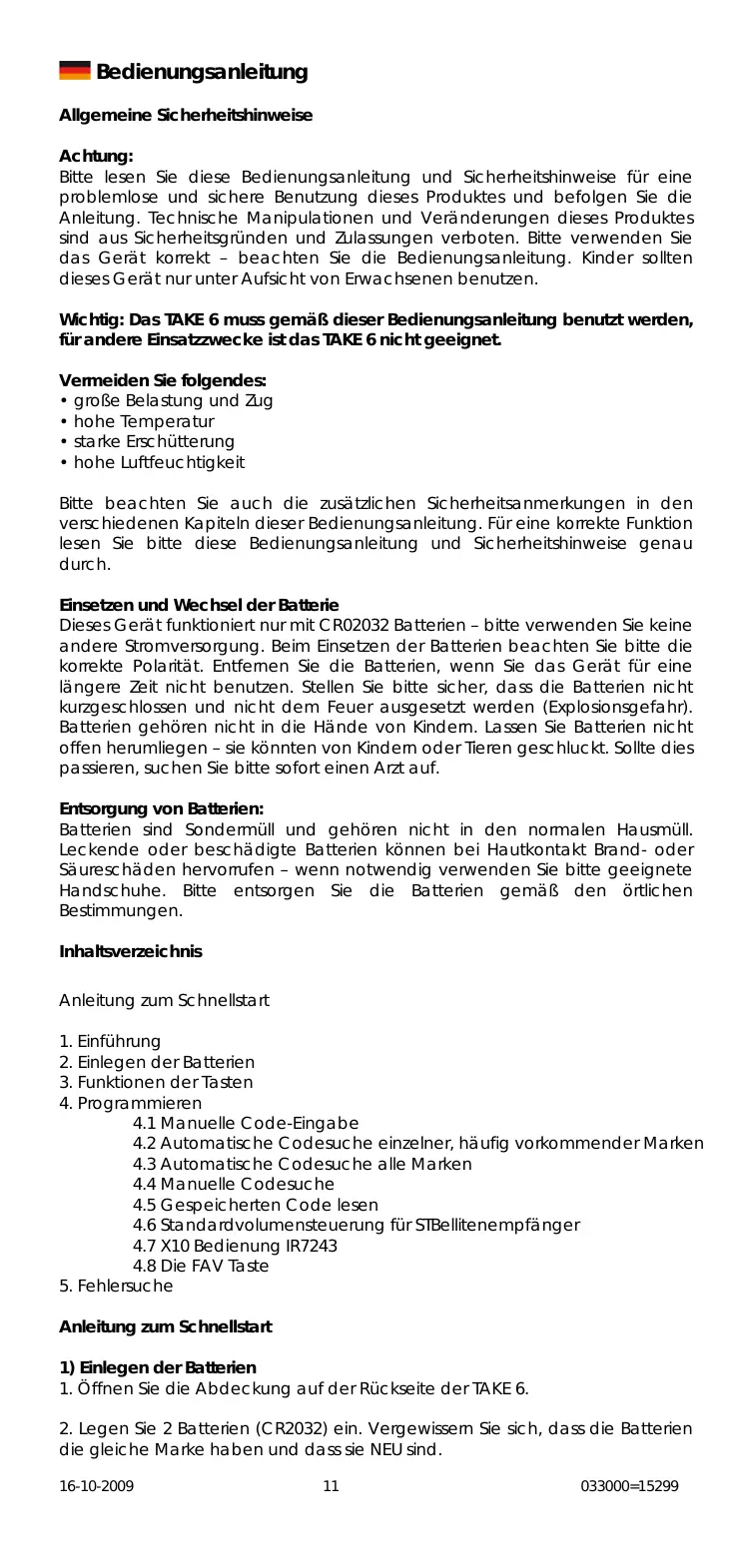 Dieses Gerät Funktioniert nur mit CR02032 Batterien –itte verwenden Sie keine andere Stromversorgung. Beim Einsetzen der Batterien beachten Sieitte die korrekte Polarität. Entfern den Sie die Batterien, wenn Sie das Gerät für eine langere Zeit nicht benutzen. Stellen Sieitte sicher, dass die Batterien nicht kurzgeschlossen und nicht dem Feuer ausgesetzt werden (Explosionsgefahr). Batterien gehören nicht in die Höhe von Kindern. Lassen Sie Batterien nicht offen herumliegen – sie konnten von Kindern oder Tieren geschluckt. Sollte dies passieren, suchen Sieitte beschäftet einen Arzt auf.