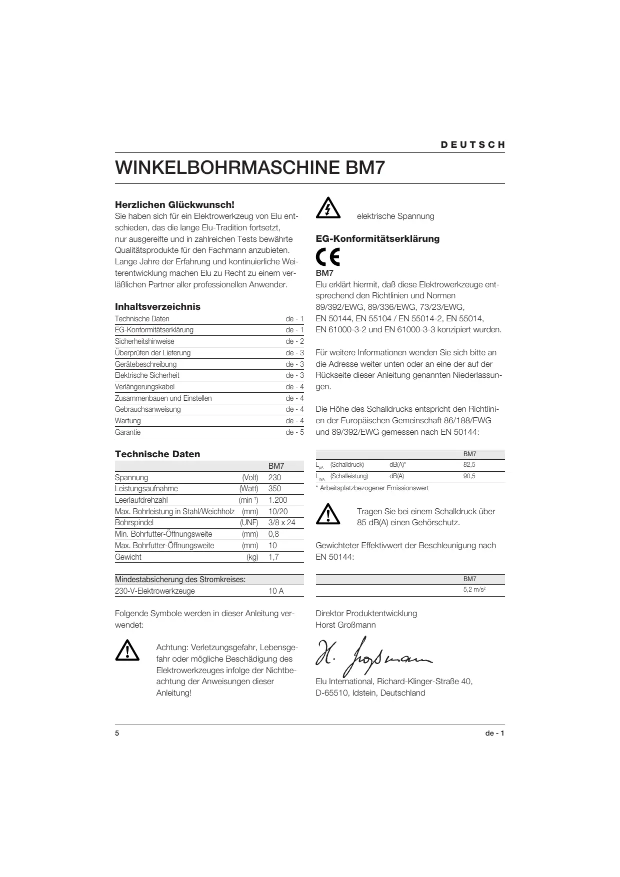 Il livello di rumorosità è conforme alle norme 86/188/CEE e 89/392/CEE, dati ricavati in base alla norma EN 50144: BM7 EN 61000-3-3. Neem voor meer informatie contact op met Elu, zie het adres hieronder of op de achterkant van deze handleiding. Niveau van de geluidsdruk overeenkomstig 86/188/EEG & 89/392/EEG, gemeten volgens EN 50144: BM7