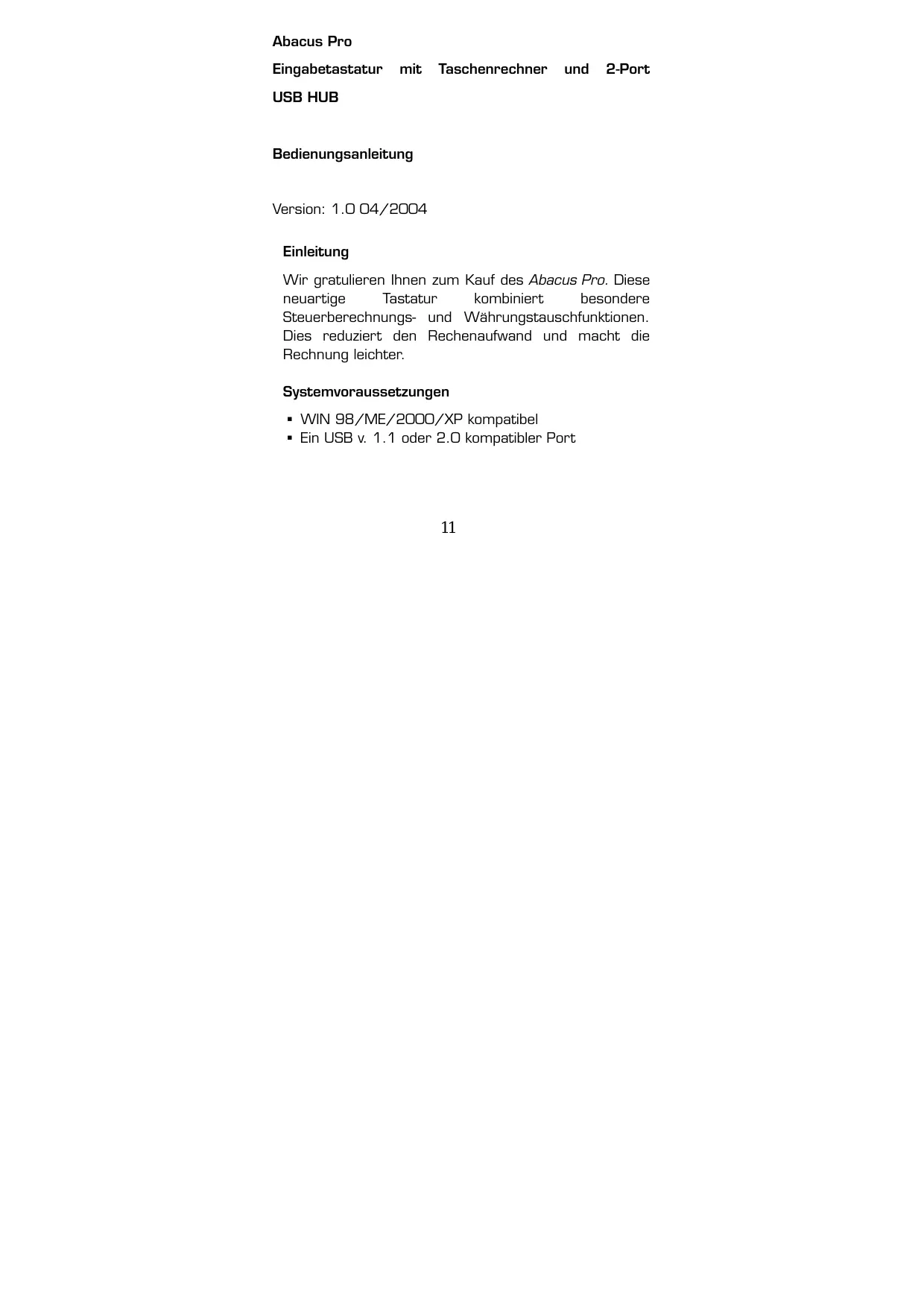 Wir gratulieren Ihnen zum Kauf des Abacus Pro. Diese neuartige Tastatur kombiniert besondere Steuerberechnungs- und Währungstauschfunktionen. Dies reduziert den Rechenaufwand und macht die Rechnung wichter.