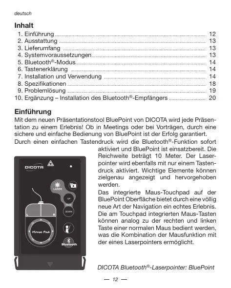 Laden Sie die Anleitung für Ihr Fernbedienung kostenlos im PDF-Format! Finden Sie Ihr Handbuch BLUEPOINT - DICOTA und nehmen Sie Ihr elektronisches Gerät wieder in die Hand. Auf dieser Seite sind alle Dokumente veröffentlicht, die für die Verwendung Ihres Geräts notwendig sind. BLUEPOINT von der Marke DICOTA.