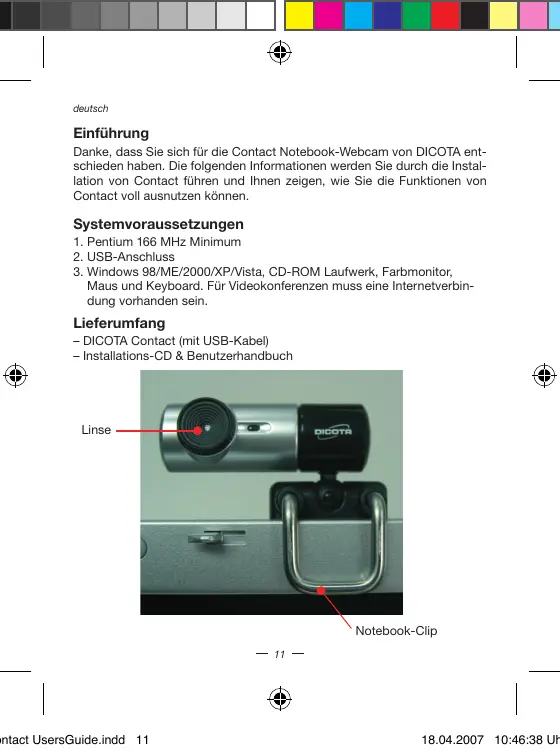 Danke, dass Sie sich für die Contact Notebook-Webcam von DICOTA entschieden haben. Die folgenden Informationen werden Sie durch die Installation von Contact führen und Ihnen zeigen, wie Sie die Funktionen von Contact voll ausnutzen können.
