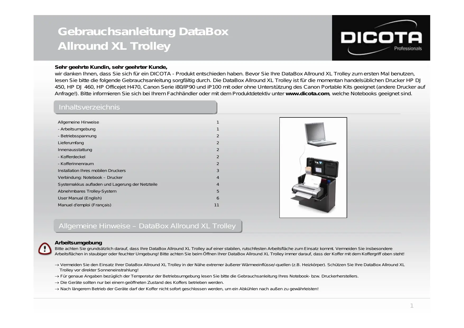 wir dken, da Sie sich fur ein DICOTA - Produkt entschieden haben. Bevor Sie Ihre DataBox Allround XL Trolley zum ersten Mal benutzen, lessen Sieitte die folgende Gebrauchsanleitung sorgfaltig durch. Die DataBox Allround XL Trolley ist fur die momentan handelsüblichen Drucker HP DJ 450, HP DJ 460, HP Officejet H470, Canon Serie i80/iP90 und iP100 mit oder ohne Unterstützung des Canon Portable Kits geeignet (andere Drucker auf Anfrage!). Bite informieren Sie sich bei Ihrem Fachhandler oder mit dem Produktdetektiv unter www.dicota.com, welche Notebooks geeignet sind.