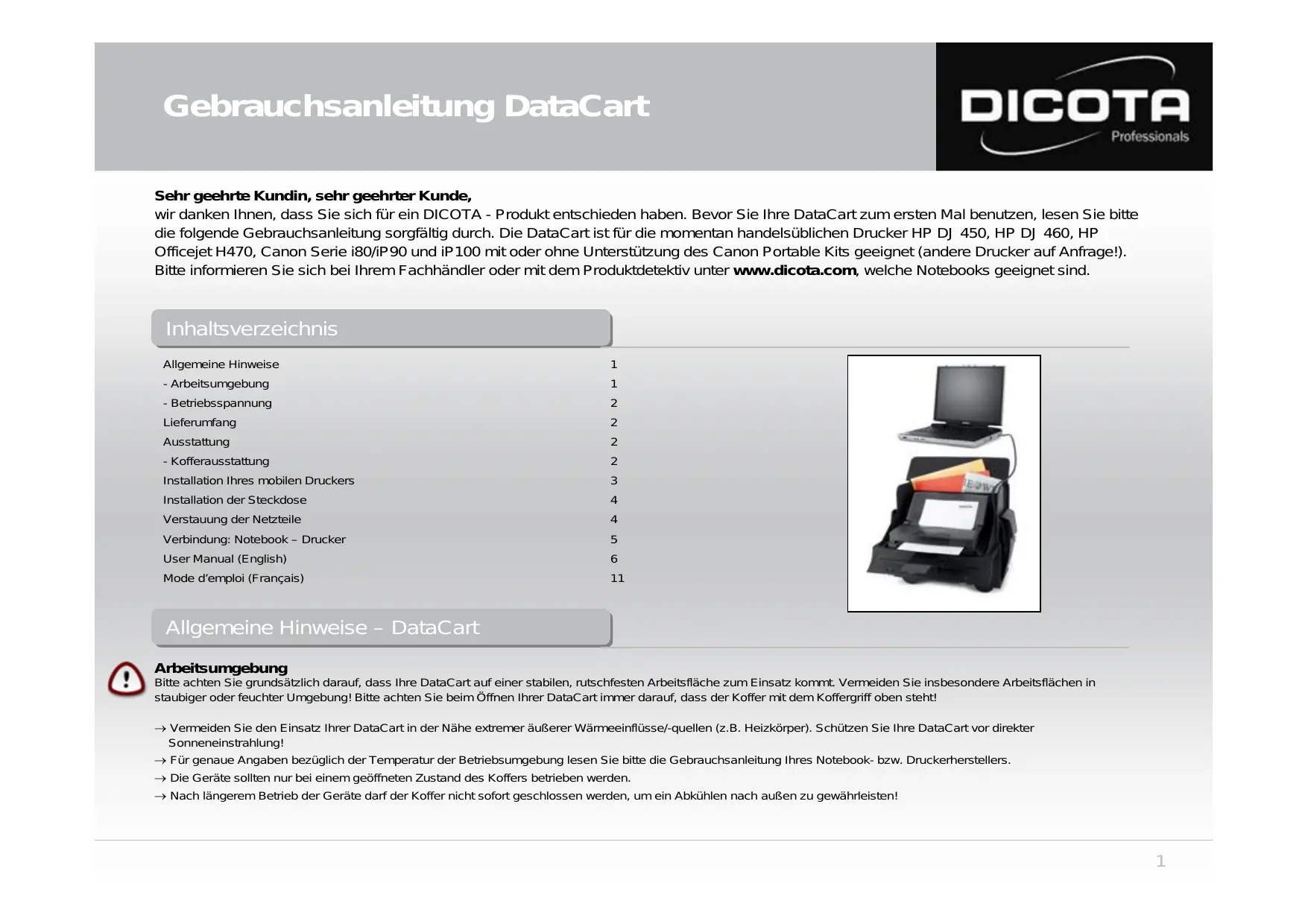 wir dken, da Sie sfr ein Dcota - Pdctt cienen henn. Bevor Si He DataCart zom eren Mal benutzen, lesen Si bte die folgende Gebrauchsanleitung sorgfaltig durch. Die DataCart ist fur die momentan handelsblichen Drucker HP DJ 450, HP DJ 460, HP Officejet H470, Canon Serie i80/iP90 und iP100 mit oder ohne Untstutzung des Canon Portable Kits geeignet (andere Drucker auf Anfrage!). Bite informieren Sie sich bei Ihrem Fachhandler oder mit dem Produktdetektiv unter www.dicota.com, welche Notebooks geeignet sind.