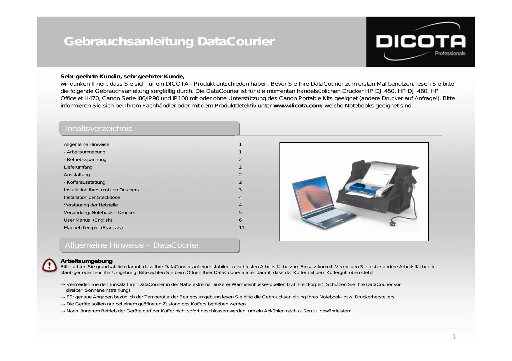 wir dken, da Sich f er Dcota - Pdkt tcden hien. Bevor Si He DataCier zum eren Mal benutzen, lesen Si bte die folgende Gebrauchsanleitung sorgfaltig durch. Die DataCourier ist fur die momentan handelsüblichen Drucker HP DJ 450, HP DJ 460, HP Officejet H470, Canon Serie i80/iP90 und iP100 mit oder ohne Unterstutzung des Canon Portable Kits geeignet (andere Drucker auf Anfrage!). Bite informieren Sie sich bei Ihrem Fachhandler oder mit dem Produktdetektiv unter www.dicota.com, welche Notebooks geeignet sind.