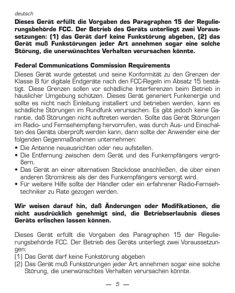 deutsch Dieses Gerät erfüllt die Vorgaben des Paragraphen 15 der Regulierungsbehörde FCC. Der Betrieb des Geräts unterliegt zwei Voraussetzungen: (1) das Gerät darf keine Funkstörung abgeben, (2) das Gerät muß Funkstörungen jeder Art annehmen sogar eine solche Störung, die unerwünschtes Verhalten verursachen könnte. Federal Communications Commission Requirements Dieses Gerät wurde getestet und seine Konformität zu den Grenzen der Klasse B für digitale Endgeräte nach den FCC-Regeln im Absatz 15 bestätigt. Diese Grenzen sollen vor schädliche Interferenzen beim Betrieb in häuslicher Umgebung schützen. Dieses Gerät generiert Funkenergie und sollte es nicht nach Einleitung installiert und betrieben werden, kann es schädliche Störungen im Rundfunk verursachen. Es gibt jedoch keine Garantie, daß Störungen nicht auftreten werden. Sollte das Gerät Störungen im Radio- und Fernsehempfang hervorrufen, was durch Aus- und Einschalten des Geräts überprüft werden kann, dann sollte der Anwender eine der folgenden Gegenmaßnahmen unternehmen: