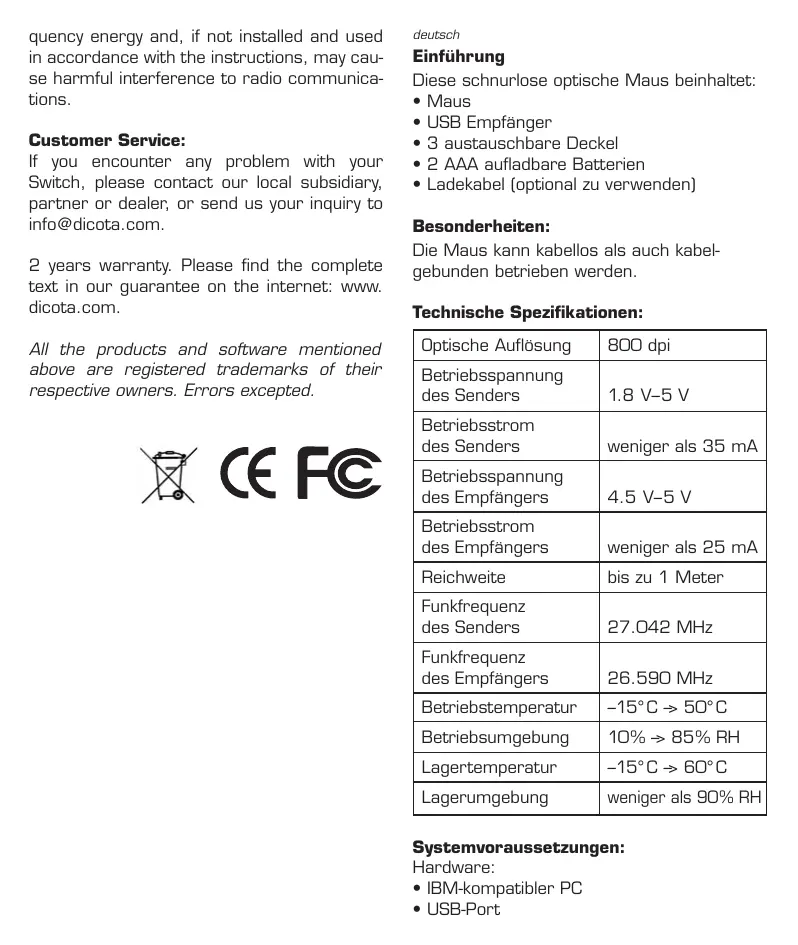 2 Jahre Garantie. Sie finden den vollständigen Text zu unseren Garantiebedingungen im Internet: www DICota.com.