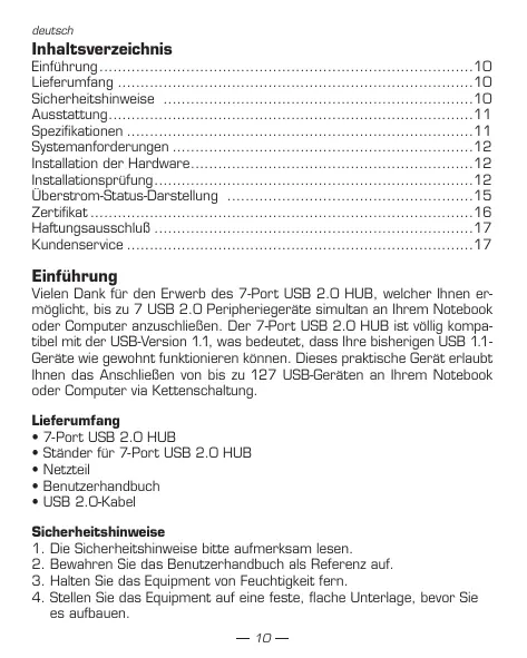 Vielen Dank für den Erwerb des 7-Port USB 2.0 HUB, welche ihren ermöglich, bis zu 7 USB 2.0 Peripheriegeräte simultan an Ihr Notebook oder Computer anzuschreiben. Die 7-Port USB 2.0 HUB ist vollkompatibel mit der USB-Version 1.1, was bedeutet, dass ihre bisherigen USB 1.1-Geräte wie gewohnt Funktionieren konnen. Dieses praktische Gerät erlaubt. Ihnen das Anschreiben von zu 127 USB-Geräten an Ihr Notebook oder Computer zehttenschaltung.