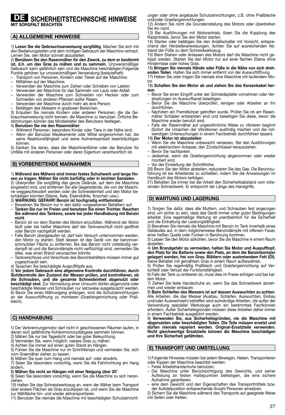 1) Toujours porter des chaussures résistantes et des pantalons longs pendant la tonte. Ne pas utiliser le matériel lorsque l’on est pieds nus ou en sandales. 2) Inspecter minutieusement toute la zone à tondre et éliminer tout objet étranger qui pourrait être projeté par la machine ou endommager l'ensemble de coupe et le moteur (pierres, morceaux de bois, fils de fer, os, etc..). 3) ATTENTION: DANGER! L’essence est hautement inflammable: – conserver le carburant dans des récipients spécialement prévus à cet effet; – faire le plein à l’aide d’un entonnoir, à l’extérieur uniquement et ne pas fumer pendant cette opération ou pendant toute manipulation de carburant; – ajouter de l’essence avant de démarrer le moteur et ne jamais enlever le bouchon du réservoir de carburant ou faire le plein lorsque le moteur est en fonctionnement ou tant qu’il est encore chaud; – ne pas démarrer le moteur si de l’essence a été répandue. Éloigner la tondeuse de la zone où le carburant a été renversé et ne provoquer aucune inflammation tant que le carburant ne s’est pas évaporé et que les vapeurs ne se sont pas dissipées; – remettre et serrer correctement les bouchons du réservoir et du récipient. 4) Remplacer les silencieux d’échappement défectueux. 5) Avant l’utilisation, toujours procéder à une vérification générale et en particulier de l’aspect des lames, des vis de fixation et de l’ensemble de coupe pour s’assurer qu’ils ne sont ni usés ni endommagés. Remplacer les lames et les vis endommagées ou usées par lots complets pour préserver le bon équilibrage. 6) Avant de commencer le travail, monter les protections (sac et déflecteur).