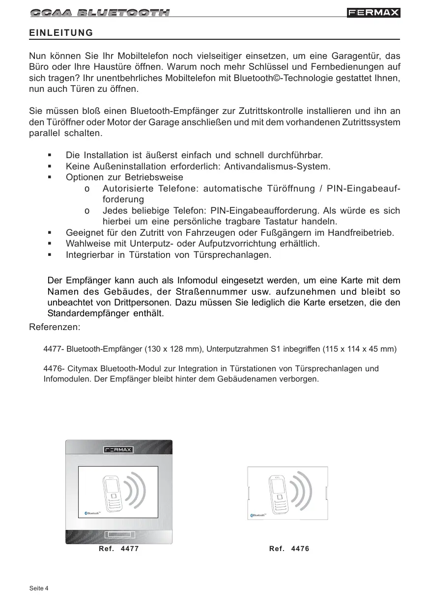 Seite 3 CCAA BLUETOOTH EINLEITUNG Nun können Sie Ihr Mobiltelefon noch vielseitiger einsetzen, um eine Garagentür, das Büro oder Ihre Haustüre öffnen. Warum noch mehr Schlüssel und Fernbedienungen auf sich tragen? Ihr unentbehrliches Mobiltelefon mit Bluetooth©-Technologie gestattet Ihnen, nun auch Türen zu öffnen. Sie müssen bloß einen Bluetooth-Empfänger zur Zutrittskontrolle installieren und ihn an den Türöffner oder Motor der Garage anschließen und mit dem vorhandenen Zutrittssystem parallel schalten.