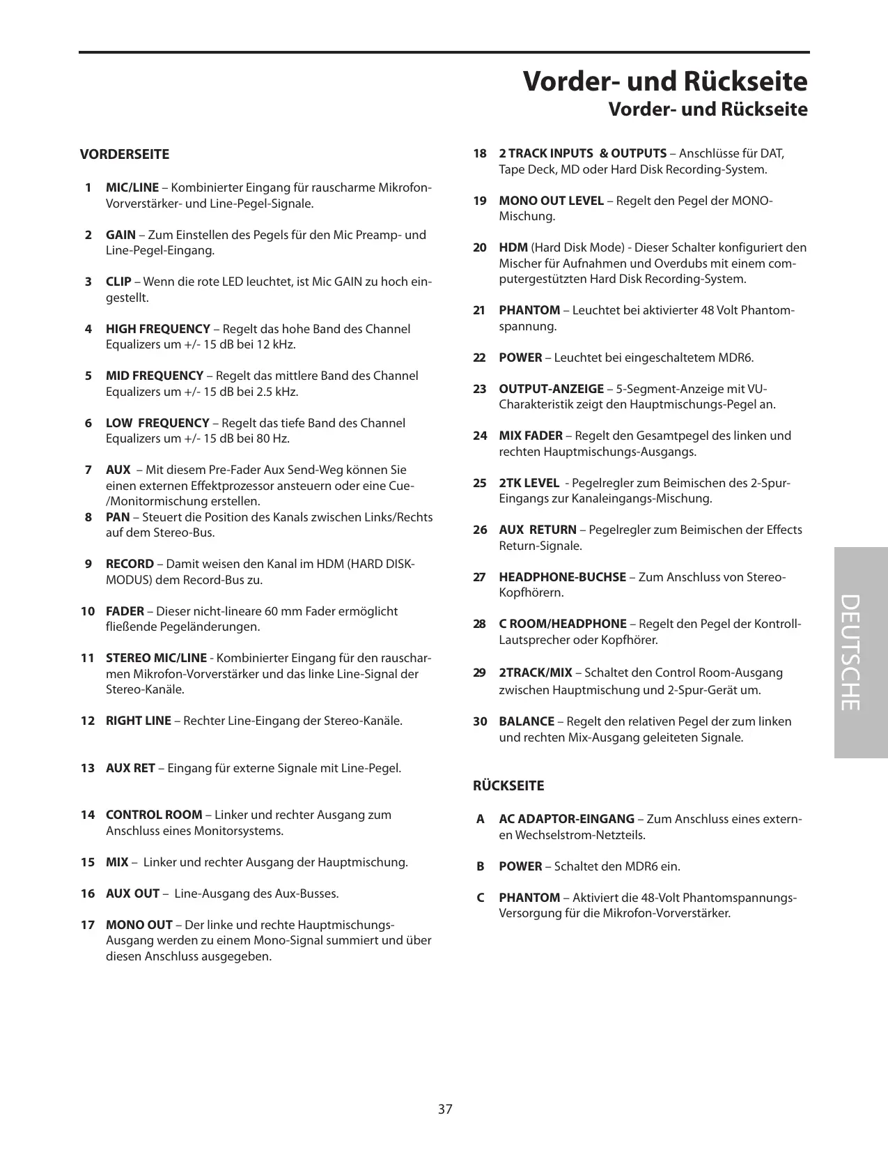Auf diesen Seiten finden Sie eine detaillierte Beschreibung der Features des MDR6 Mischers sowie eine Beschreibung der vorder- und rückseitigen Bedienfelder, schrittweise Anleitungen für dessen Einrichtung und Einsatz – plus ausfuhrliche Technische Daten. Sie werden auch eine Garantiekarte findingen, die Sie ausfüllen und zurückschicken sollenen, damit Sie in Zukunft technischen Online Support und aktuelle Informationen über these and andere Samson-Produkte erhalten.