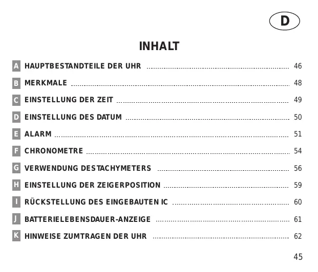 Zur Lektüre dieser Gebrauchsanleitung sollen den Sie die nebenstehend gezeigte Übersichtsdarstellung der Uhr ausklappen und im Blick gehalten. Die in den einzelnen Abschnitten der Gebrauchsanleitung verwendeten Zeichen (A, B, usw.) entsprechen den Kennzeichnungen in dieser Übersicht.