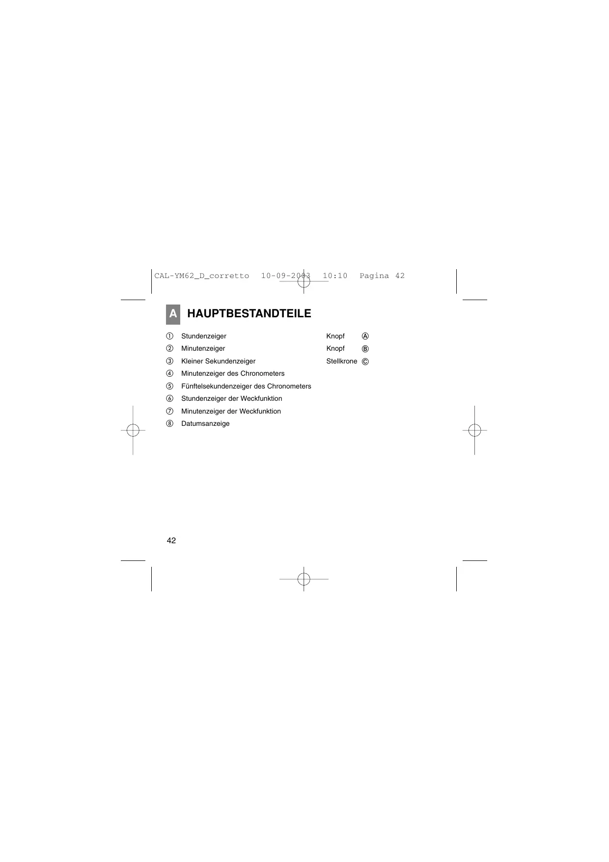 Zur Lektüre dieser Gebrauchsanleitung sollen den Sie die Nebenstehend gezeigte Übersichtsdarstellung der Uhr ausklappen und im Blick gehalten. Die in den einzelnen Abschnittten der Gebrauchsanleitung verwendeten Zeichen (A, B, usw.) entsprechen den Kennzeichnungen in dieser Übersicht.