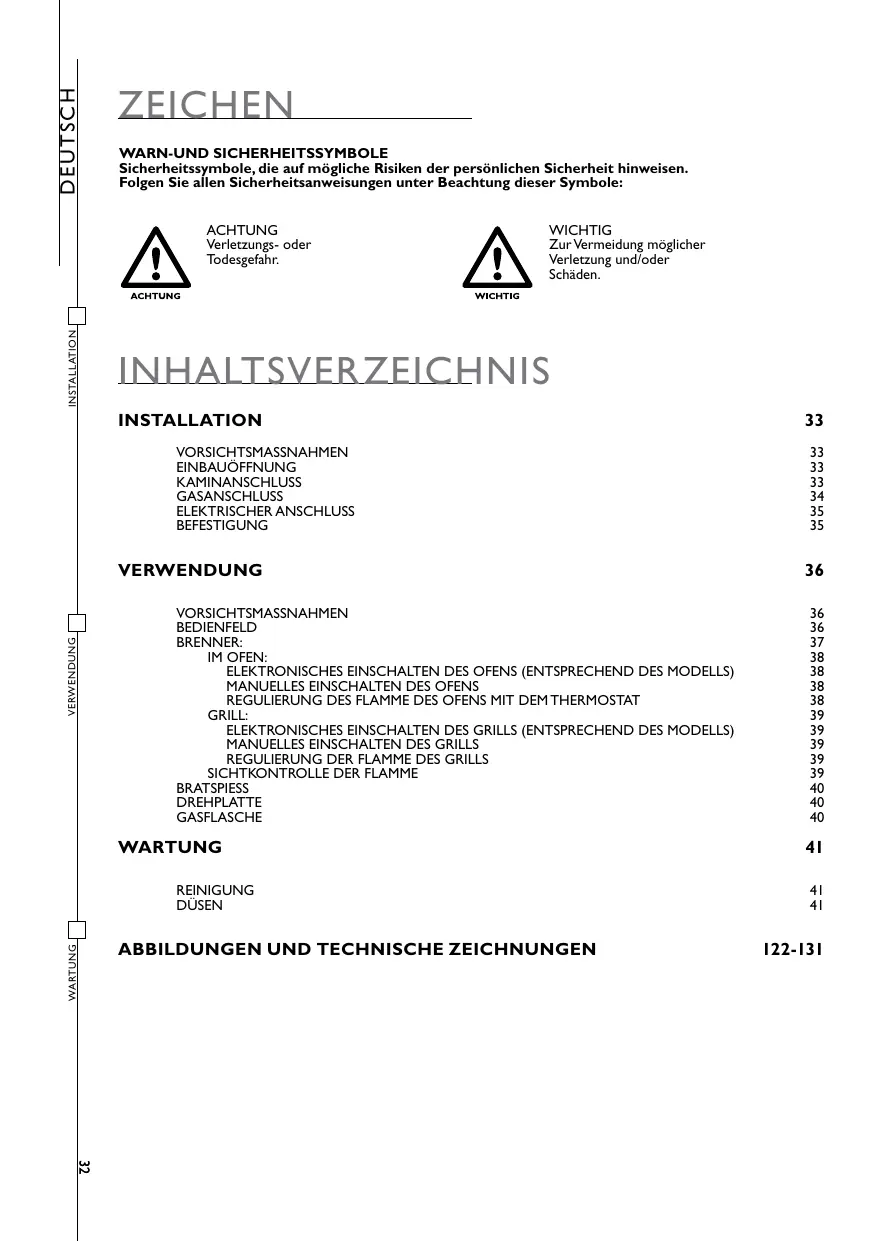 Le démontage et le montage des injecteurs doit être effectué en maintenant bloqué (à l’aide d’un outil approprié) le porte-injecteur (FIG. 9 - PAGE 131). USAGE LES INTERVENTIONS DOIVENT ETRE EFFECTUEES PAR DU PERSONNEL AUTORISE. APRES CES OPERATIONS ON DECLINE TOUTE RESPONSABILITE DERIVANT DE L’INTERVENTION MEME. DEUTSCH ZEICHEN WARN-UND SICHERHEITSSYMBOLE Sicherheitssymbole, die auf mögliche Risiken der persönlichen Sicherheit hinweisen. Folgen Sie allen Sicherheitsanweisungen unter Beachtung dieser Symbole: INSTALLATION ACHTUNG Verletzungs- oder Todesgefahr. WICHTIG Zur Vermeidung möglicher Verletzung und/oder Schäden. INHALTSVERZEICHNIS INSTALLATION VORSICHTSMASSNAHMEN EINBAUÖFFNUNG KAMINANSCHLUSS GASANSCHLUSS ELEKTRISCHER ANSCHLUSS BEFESTIGUNG VERWENDUNG VERWENDUNG VORSICHTSMASSNAHMEN BEDIENFELD BRENNER: Im Ofen: ELEKTRONISCHES EINSCHALTEN DES OFENS (ENTSPRECHEND DES MODELLS)