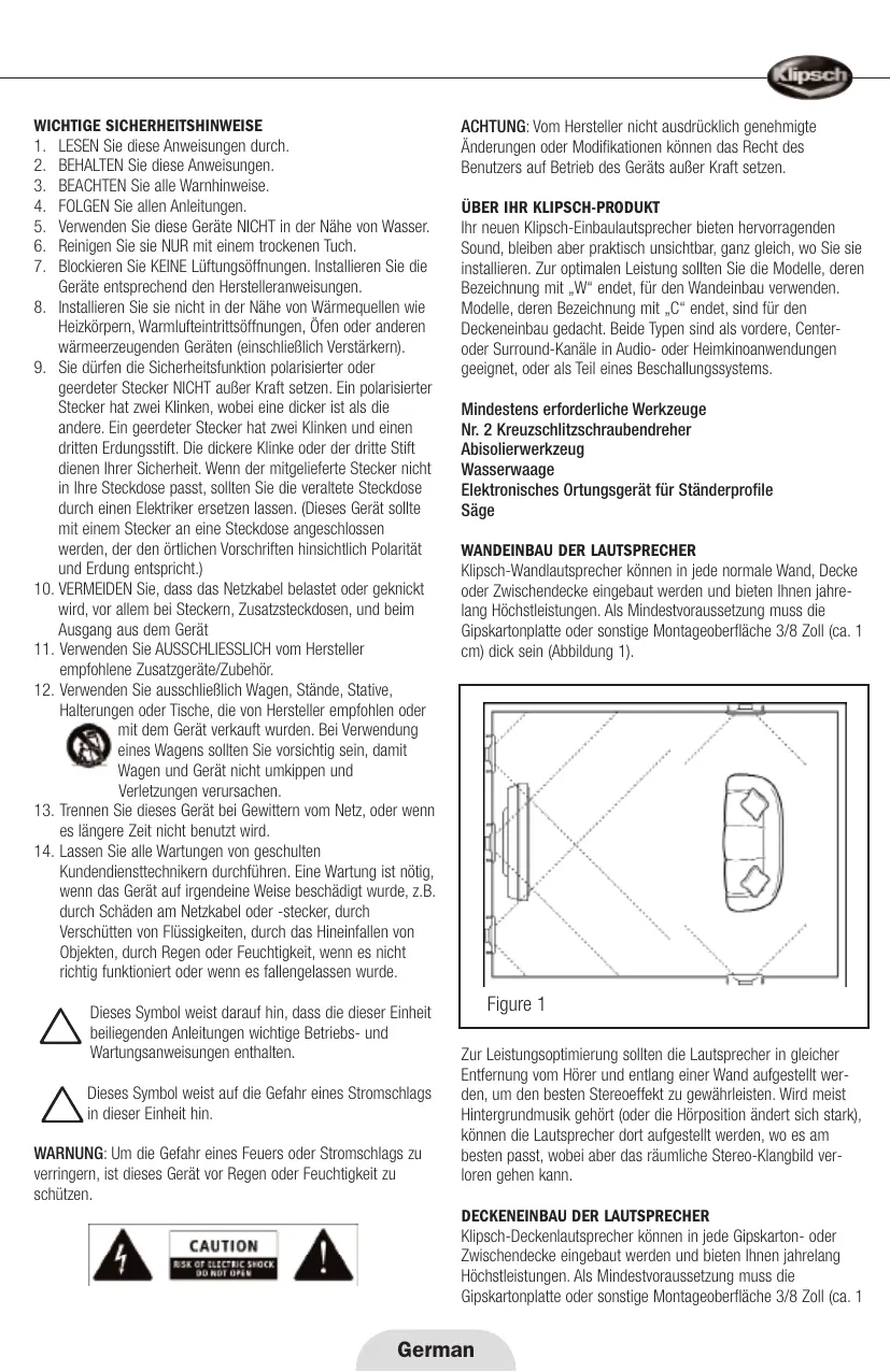 Ihr neuen Klipsch-Einbaulaufsprecherieten hervorragenden Sound,bleibenaberpraktischunsichtbar,ganzgleich,woSie sie installieren.Zur optimalen Leistung soltenSie die Modelle,deren Bezeichnung mit ^ endet,fort den Wandeinbau verwenden. Modelle,derenBezeichnungmit ^ endet,sindforden Deckeneinbau gedacht.Beide Typen sind als vordere,Center- oder Surround-Kanale in Audio-oder Heimkinoanwendungen geeignet,oderalsTeile eines Beschallungssystems.
