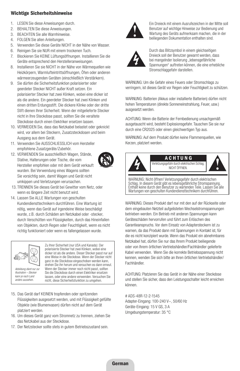 WichtigeSafety Sicherheitshinweise Important Information 1. LESEN Sie diese Anweisungen durch. 2. BEHALTEN Sie diese Anweisungen. 3. BEACHTEN Sie alle Warnhinweise. 4. FOLGEN Sie allen Anleitungen. 5. Verwenden Sie diese Geräte NICHT in der Nähe von Wasser. 6. Reinigen Sie sie NUR mit einem trockenen Tuch. 7. Blockieren Sie KEINE Lüftungsöffnungen. Installieren Sie die Geräte entsprechend den Herstelleranweisungen. 8. Installieren Sie sie NICHT in der Nähe von Wärmequellen wie Heizkörpern, Warmlufteintrittsöffnungen, Öfen oder anderen wärmeerzeugenden Geräten (einschließlich Verstärkern). 9. Sie dürfen die Sicherheitsfunktion polarisierter oder geerdeter Stecker NICHT außer Kraft setzen. Ein polarisierter Stecker hat zwei Klinken, wobei eine dicker ist als die andere. Ein geerdeter Stecker hat zwei Klinken und einen dritten Erdungsstift. Die dickere Klinke oder der dritte Stift dienen Ihrer Sicherheit. Wenn der mitgelieferte Stecker nicht in Ihre Steckdose passt, sollten Sie die veraltete Steckdose durch einen Elektriker ersetzen lassen. 10. V ERMEIDEN Sie, dass das Netzkabel belastet oder geknickt wird, vor allem bei Steckern, Zusatzsteckdosen und beim Ausgang aus dem Gerät. 11. Verwenden Sie AUSSCHLIESSLICH vom Hersteller empfohlene Zusatzgeräte/Zubehör. 12. V ERWENDEN Sie ausschließlich Wagen, Stände, Stative, Halterungen oder Tische, die vom Hersteller empfohlen oder mit dem Gerät verkauft wurden. Bei Verwendung eines Wagens sollten Sie vorsichtig sein, damit Wagen und Gerät nicht umkippen und Verletzungen verursachen. 13. T RENNEN Sie dieses Gerät bei Gewitter vom Netz, oder wenn es längere Zeit nicht benutzt wird. 14. L assen Sie ALLE Wartungen von geschulten Kundendiensttechnikern durchführen. Eine Wartung ist nötig, wenn das Gerät auf irgendeine Weise beschädigt wurde, z.B. durch Schäden am Netzkabel oder -stecker, durch Verschütten von Flüssigkeiten, durch das Hineinfallen von Objekten, durch Regen oder Feuchtigkeit, wenn es nicht richtig funktioniert oder wenn es fallengelassen wurde.