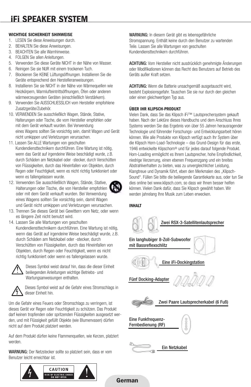 WARNUNG: In diesem Gerät gibt es lebensgefährliche Stromspannung. Enthält keine durch den Benutzer zu wartenden Teile. Lassen Sie alle Wartungen von geschulten Kundendiensttechnikern durchführen. ACHTUNG: Vom Hersteller nicht ausdrücklich genehmigte Änderungen oder Modifikationen können das Recht des Benutzers auf Betrieb des Geräts außer Kraft setzen. ACHTUNG: Wenn die Batterie unsachgemäß ausgetauscht wird, besteht Explosionsgefahr. Tauschen Sie sie nur durch den gleichen oder einen gleichwertigen Typ aus. ÜBER IHR KLIPSCH-PRODUKT Vielen Dank, dass Sie das Klipsch iFi™ Lautsprechersystem gekauft haben. Nach der Lektüre dieses Handbuchs und dem Anschluss Ihres Systems werden Sie das Ergebnis von über 55 Jahren herausragender Technologie und führender Forschungs- und Entwicklungsarbeit hören können. Wie alle Produkte von Klipsch verfügt auch Ihr System über die Klipsch Horn-Load-Technologie – das Grund-Design für das erste, 1946 entwickelte Klipschorn® und für jedes darauf folgende Produkt. Horn-Loading ermöglicht es Ihrem Lautsprecher, hohe Empfindlichkeit, niedrige Verzerrung, einen ebenen Frequenzgang und ein breites Abstrahlverhalten zu bieten, was zu unvergleichlicher Leistung, Klangtreue und Dynamik führt, eben den Merkmalen des „KlipschSound“. Füllen Sie bitte die beiliegende Garantiekarte aus, oder tun Sie dies online bei www.klipsch.com, so dass wir Ihnen besser helfen können. Vielen Dank dafür, dass Sie Klipsch gewählt haben. Wir werden jahrelang Ihre Musik zum Leben erwecken.