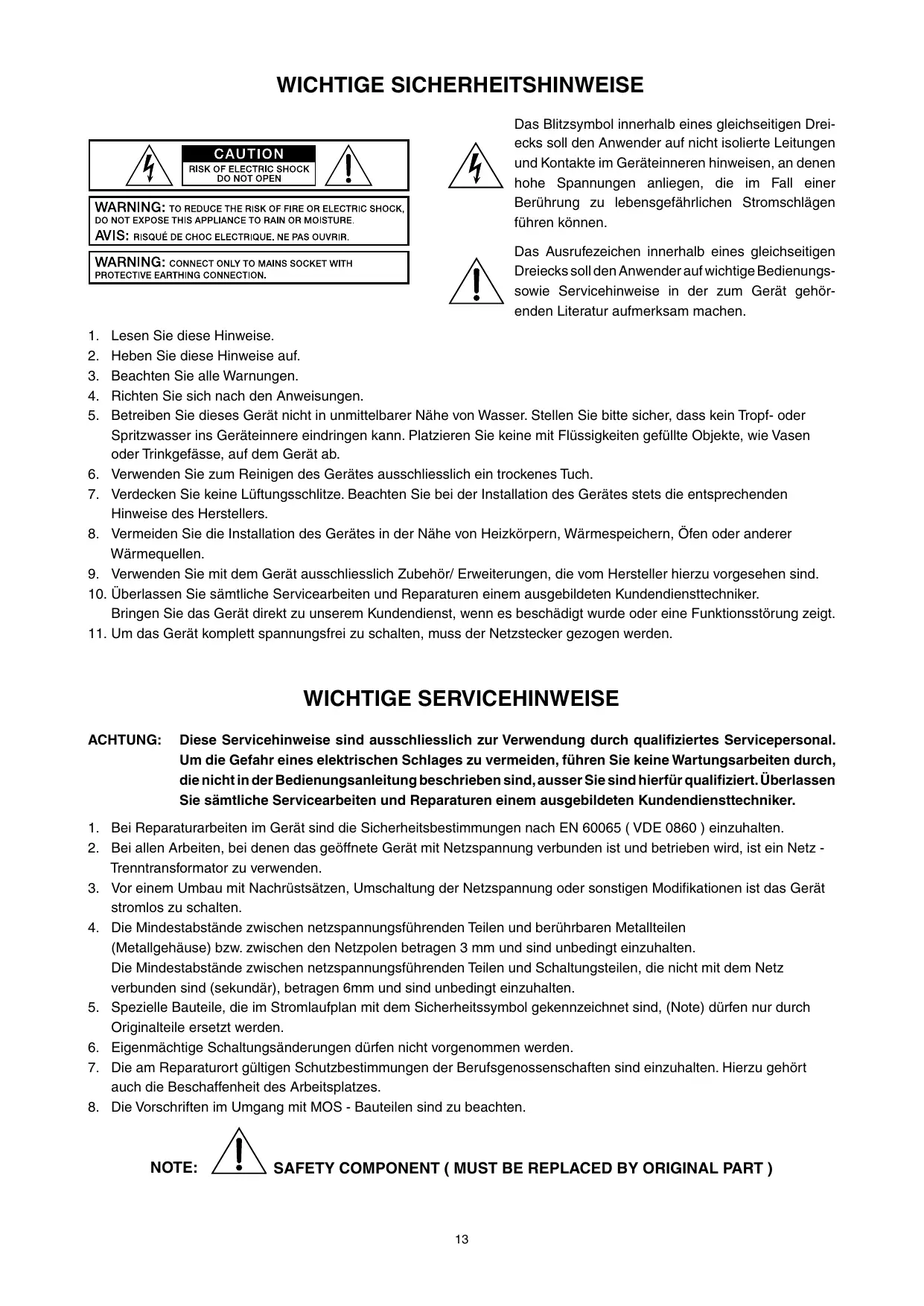 WICHTIGE SERVICEHINWEISE ACHTUNG: Diese Servicehinweise sind ausschliesslich zur Verwendung durch qualifiziertes Servicepersonal. Um die Gefahr eines elektrischen Schlages zu vermeiden, führen Sie keine Wartungsarbeiten durch, die nicht in der Bedienungsanleitung beschrieben sind, ausser Sie sind hierfür qualifiziert. Überlassen Sie sämtliche Servicearbeiten und Reparaturen einem ausgebildeten Kundendiensttechniker.