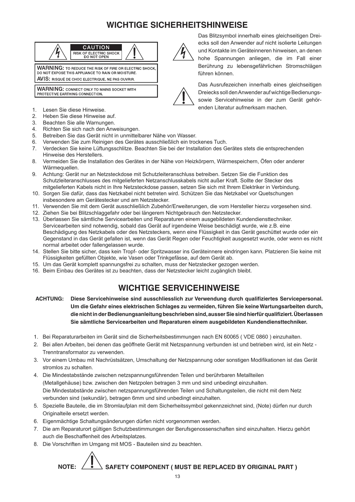 Das Ausrufezeichen innerhalb eines gleichseitigen Dreiecks soll den Anwender auf wichtige Bedienungssowie Servicehinweise in der zum Gerät gehörenden Literatur aufmerksam machen. Lesen Sie diese Hinweise. Heben Sie diese Hinweise auf. Beachten Sie alle Warnungen. Richten Sie sich nach den Anweisungen. Betreiben Sie das Gerät nicht in unmittelbarer Nähe von Wasser. Verwenden Sie zum Reinigen des Gerätes ausschließlich ein trockenes Tuch. Verdecken Sie keine Lüftungsschlitze. Beachten Sie bei der Installation des Gerätes stets die entsprechenden Hinweise des Herstellers. Vermeiden Sie die Installation des Gerätes in der Nähe von Heizkörpern, Wärmespeichern, Öfen oder anderer Wärmequellen. Achtung: Gerät nur an Netzsteckdose mit Schutzleiteranschluss betreiben. Setzen Sie die Funktion des Schutzleiteranschlusses des mitgelieferten Netzanschlusskabels nicht außer Kraft. Sollte der Stecker des mitgelieferten Kabels nicht in Ihre Netzsteckdose passen, setzen Sie sich mit Ihrem Elektriker in Verbindung. Sorgen Sie dafür, dass das Netzkabel nicht betreten wird. Schützen Sie das Netzkabel vor Quetschungen insbesondere am Gerätestecker und am Netzstecker. Verwenden Sie mit dem Gerät ausschließlich Zubehör/Erweiterungen, die vom Hersteller hierzu vorgesehen sind. Ziehen Sie bei Blitzschlaggefahr oder bei längerem Nichtgebrauch den Netzstecker. Überlassen Sie sämtliche Servicearbeiten und Reparaturen einem ausgebildeten Kundendiensttechniker. Servicearbeiten sind notwendig, sobald das Gerät auf irgendeine Weise beschädigt wurde, wie z.B. eine Beschädigung des Netzkabels oder des Netzsteckers, wenn eine Flüssigkeit in das Gerät geschüttet wurde oder ein Gegenstand in das Gerät gefallen ist, wenn das Gerät Regen oder Feuchtigkeit ausgesetzt wurde, oder wenn es nicht normal arbeitet oder fallengelassen wurde. Stellen Sie bitte sicher, dass kein Tropf- oder Spritzwasser ins Geräteinnere eindringen kann. Platzieren Sie keine mit Flüssigkeiten gefüllten Objekte, wie Vasen oder Trinkgefässe, auf dem Gerät ab. Um das Gerät komplett spannungsfrei zu schalten, muss der Netzstecker gezogen werden. Beim Einbau des Gerätes ist zu beachten, dass der Netzstecker leicht zugänglich bleibt. WICHTIGE SERVICEHINWEISE ACHTUNG: Diese Servicehinweise sind ausschliesslich zur Verwendung durch qualifiziertes Servicepersonal. Um die Gefahr eines elektrischen Schlages zu vermeiden, führen Sie keine Wartungsarbeiten durch, die nicht in der Bedienungsanleitung beschrieben sind, ausser Sie sind hierfür qualifiziert. Überlassen Sie sämtliche Servicearbeiten und Reparaturen einem ausgebildeten Kundendiensttechniker.