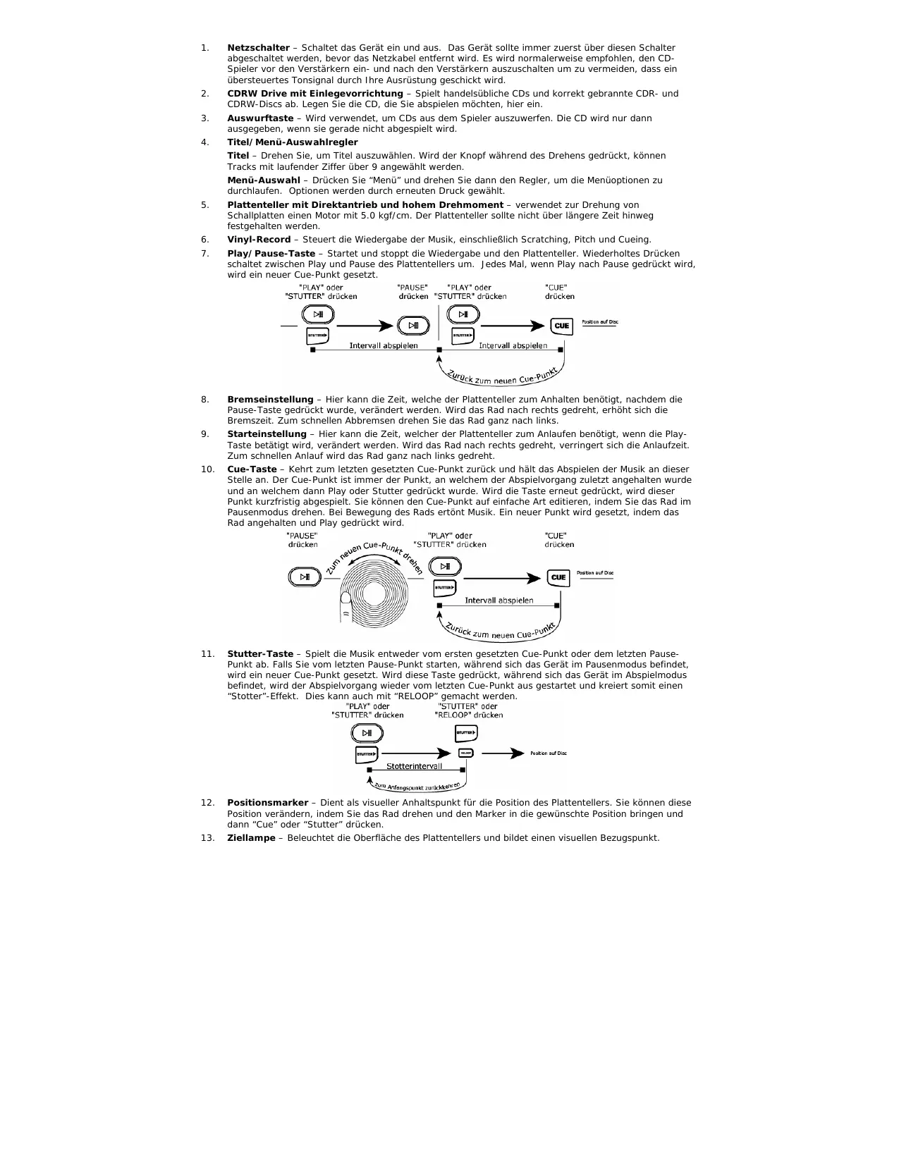 Cue-Taste – Kehrt zum letzten gesetzten Cue-Punkt zurück und hält das Abspielen der Musik an dieser Stelle an. Der Cue-Punkt ist immer der Punkt, an welchem der Abspielvorgang zuletzt angehalten wurde und an welchem dann Play oder Stutter gedrückt wurde. Wird die Taste erneut gedrückt, wird dieser Punkt kurzfristig abgespielt. Sie können den Cue-Punkt auf einfache Art editieren, indem Sie das Rad im Pausenmodus drehen. Bei Bewegung des Rads ertönt Musik. Ein neuer Punkt wird gesetzt, indem das Rad angehalten und Play gedrückt wird.