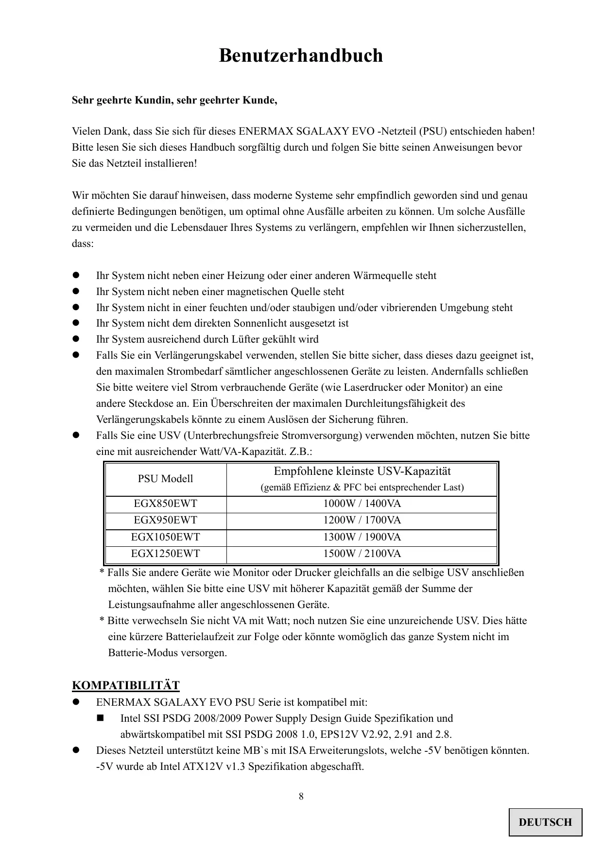 KOMPATIBILITÄT ENERMAX SGALAXY EVO PSU Serie ist kompatibel mit: Intel SSI PSDG 2008/2009 Power Supply Design Guide Spezifikation und abwärtskompatibel mit SSI PSDG 2008 1.0, EPS12V V2.92, 2.91 and 2.8. Dieses Netzteil unterstützt keine MB`s mit ISA Erweiterungslots, welche -5V benötigen könnten. -5V wurde ab Intel ATX12V v1.3 Spezifikation abgeschafft. 8