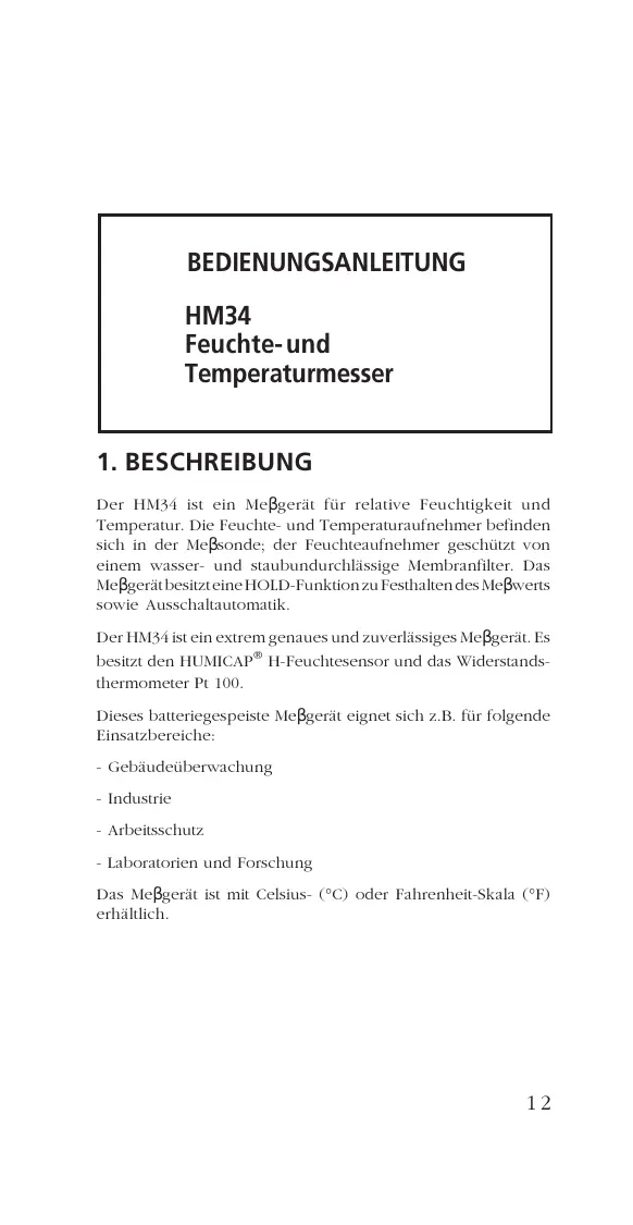 BEDIENUNGSANLEITUNG HM34 Feuchte- und Temperaturmesser