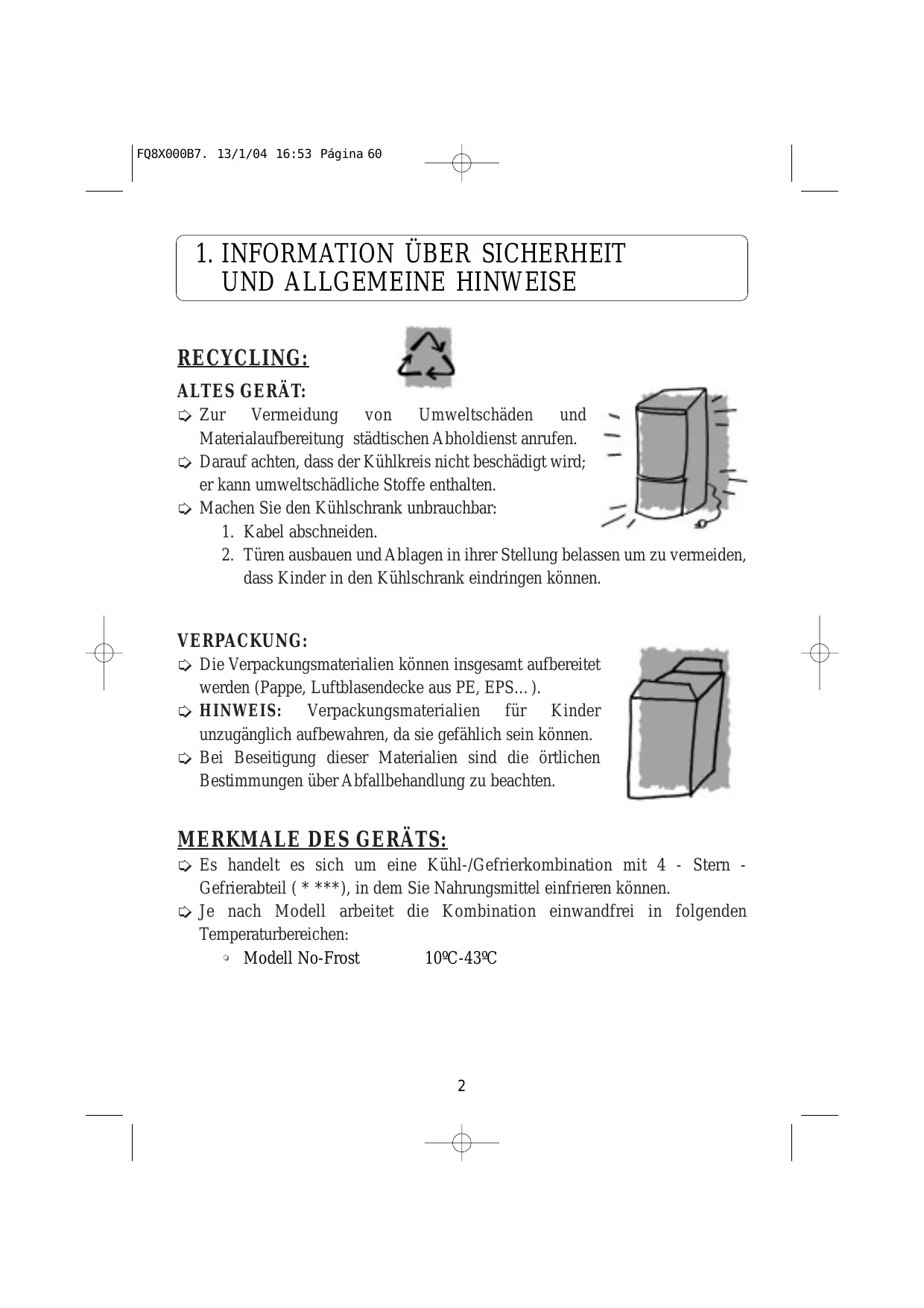 DEUTSCH KÜHLFACH Fisch und Fleisch FQ8X000B7. 13/1/04 16:53 Página 62 SICHERHEIT: Das von Ihnen gewählte Modell enthält das Kühlmittel R600a. Bitte beachten Sie: