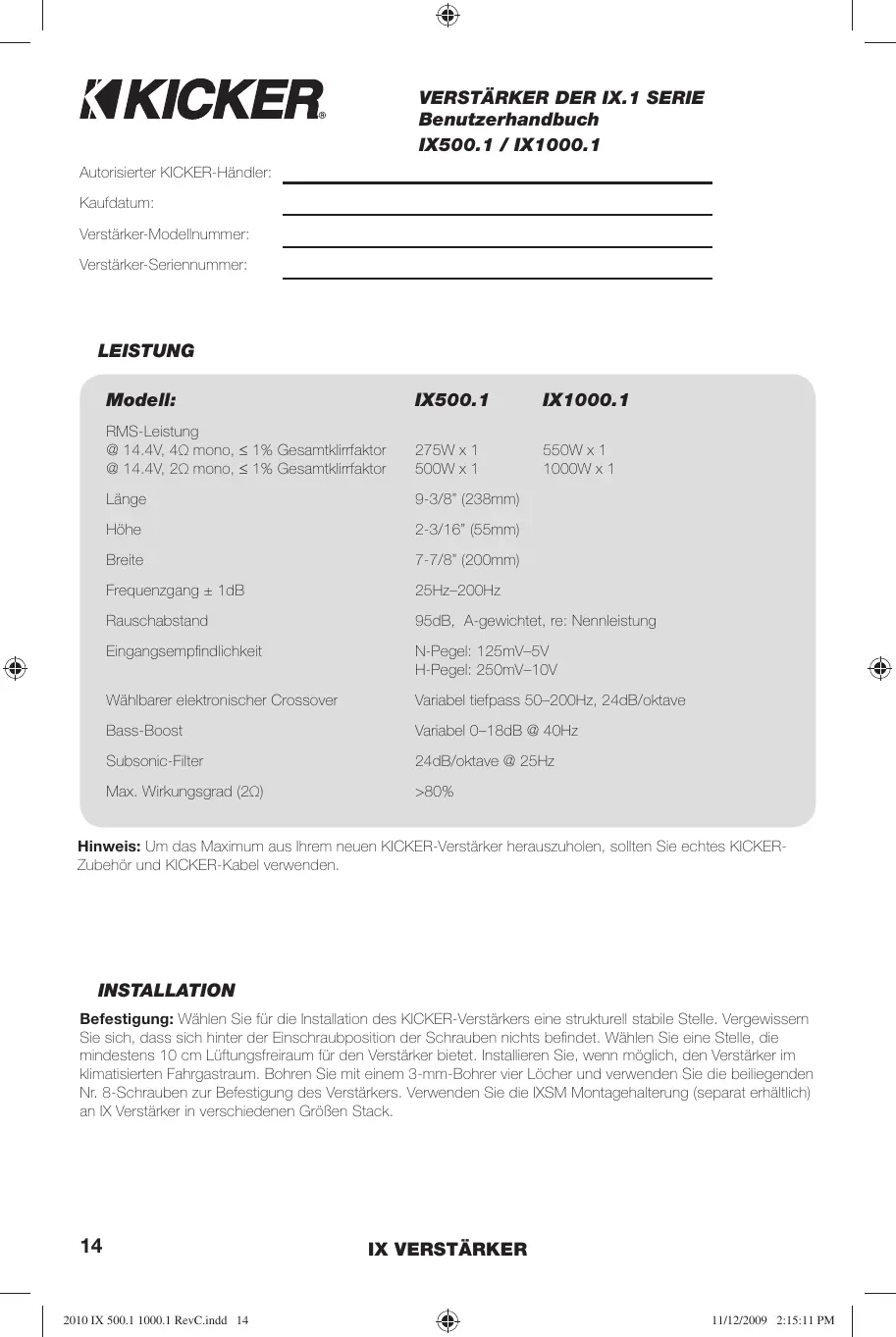 Hinweis: Um das Maximum aus Ihr dem neuen KICKER-Veränder herauszuholen, sollen den Sie echtes KICKER-Zubehör und KICKER-Kabel verwenden.