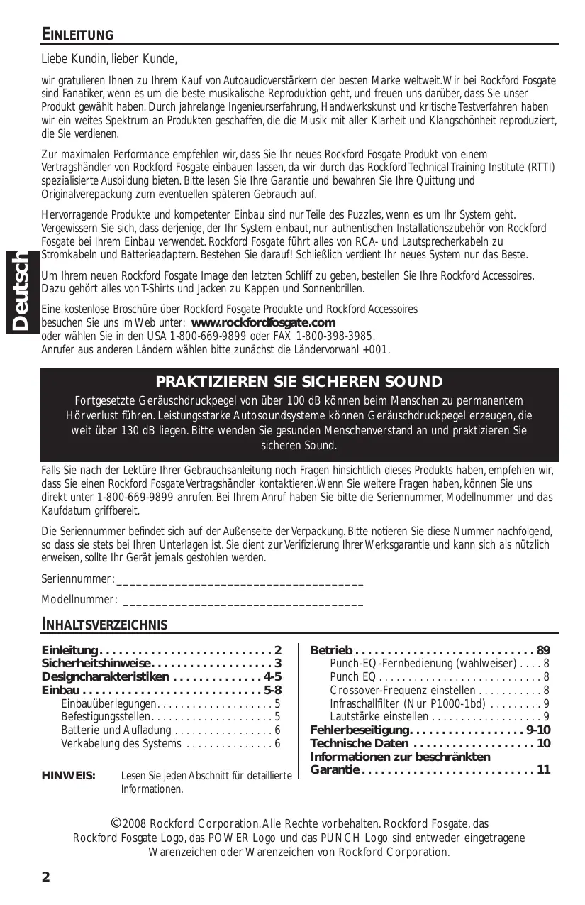 Falls Sie nach der Lekture ihrer Gebrauchsanleitung noch Fragen hinsichtlich thesees Produkte haben, empfehlen wir, dass Sie einen Rockford Fosgate Vertragshandler kontaktieren. Wenn Sie weitere Fragen haben, konnen Sie uns direkt unter 1-800-669-9899 anrufen. Bei Ihr dem Anruf haben Sieitte die Seriennummer, Modellnummer und das Kaufdatum griffbereit.