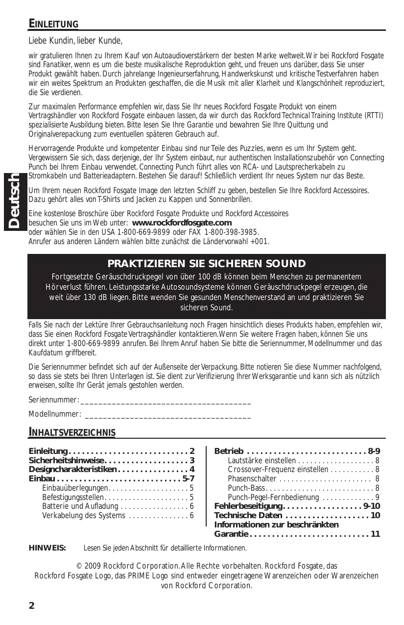 Falls Sie nach der Lekture ihrer Gebrauchsanleitung noch Fragen hinsichtlich these Products haben, empfehlen wir, dass Sie einen Rockford Fosgate Vertragshandler kontaktieren. Wenn Sie weitere Fragen haben, konnen Sie uns direkt unter 1-800-669-9899 anrufen. Bei Ihr dem Anruf haben Sieitte die Seriennummer, Modellnummer und das Kaufdatum griffbereit.